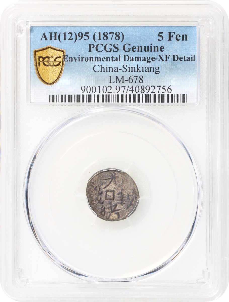 Sinkiang Province, silver 5 fen, AH(12)95 (1878), (LM-678), PCGS Genuine Environmental Damage - XF Detail, #40892756