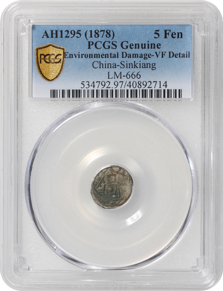 Sinkiang Province, silver 5 fen, AH1295(1878), (LM-666), PCGS Genuine Environmental Damage - VF Detail, #40892714.