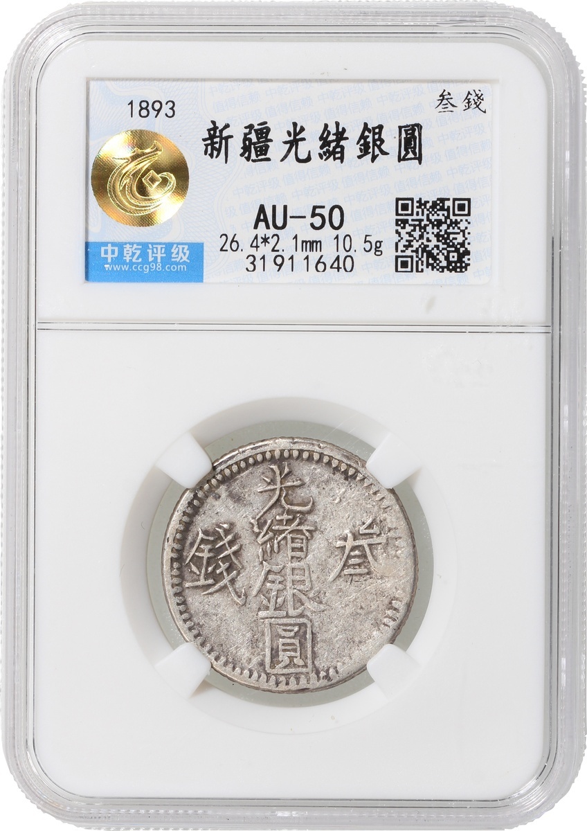 1893年新疆光緒銀圓叁錢,中乾評級AU50,編號31911640