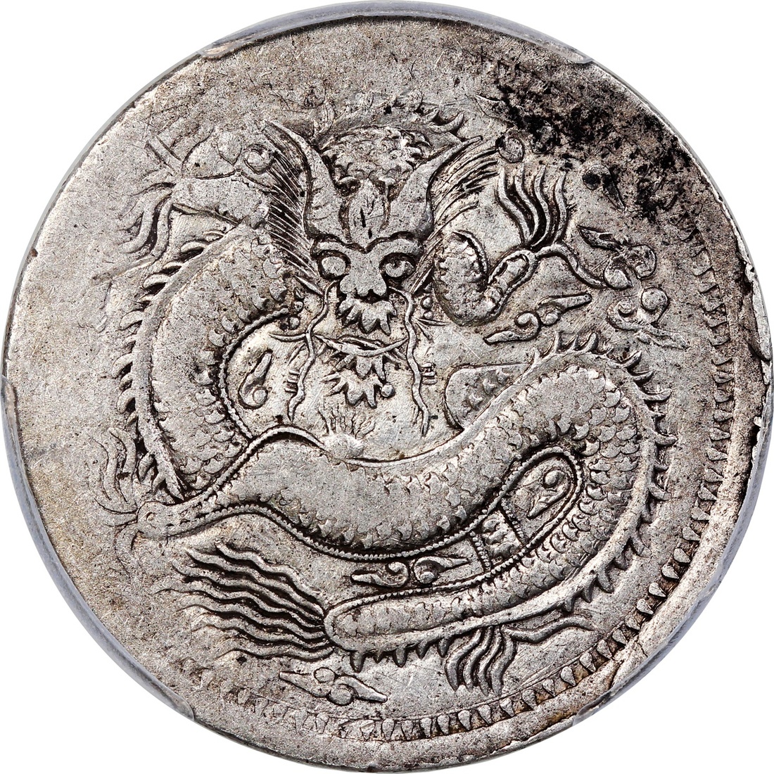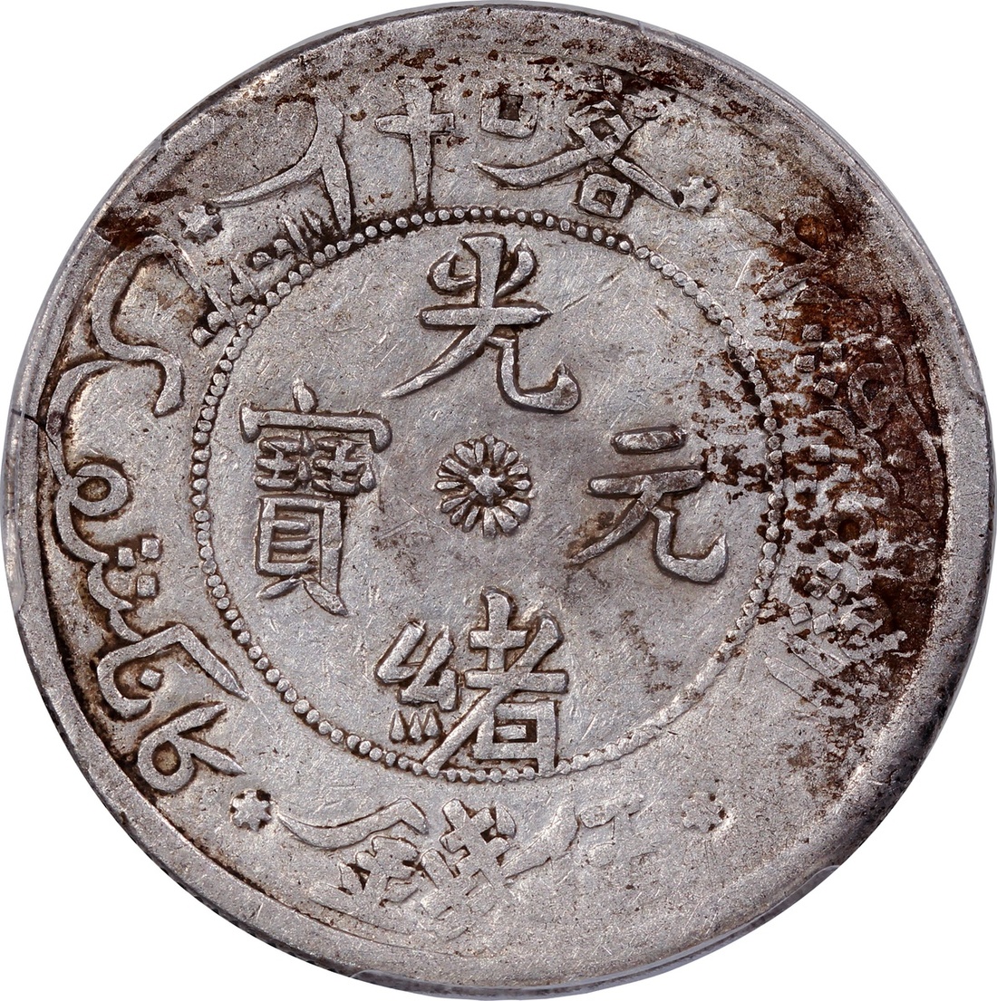 Sinkiang Province, silver 5 Mace, AH1323 (1905), Kashgar Mint, 'Guangxu Yuan Bao', (Y-21.4), PCGS Genuine Environmental Damage - XF Detail