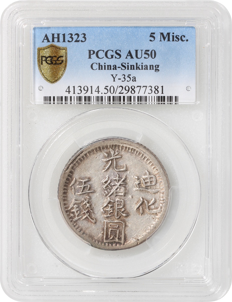 Sinkiang Province, silver 5 miscals, AH1323 (1905), Dihua Mint, 'Guangxu Yin Yuan', (Y-35a), PCGS AU50. #29877381