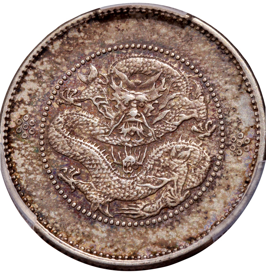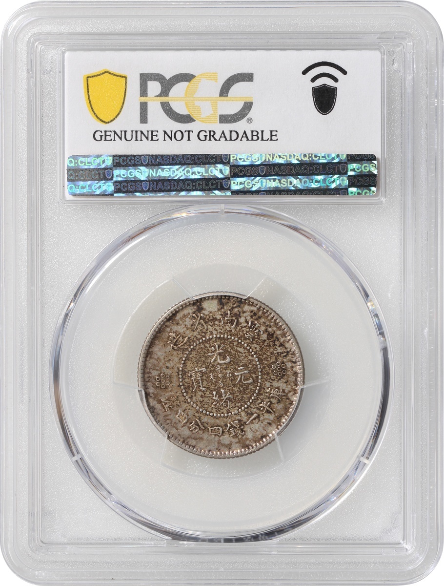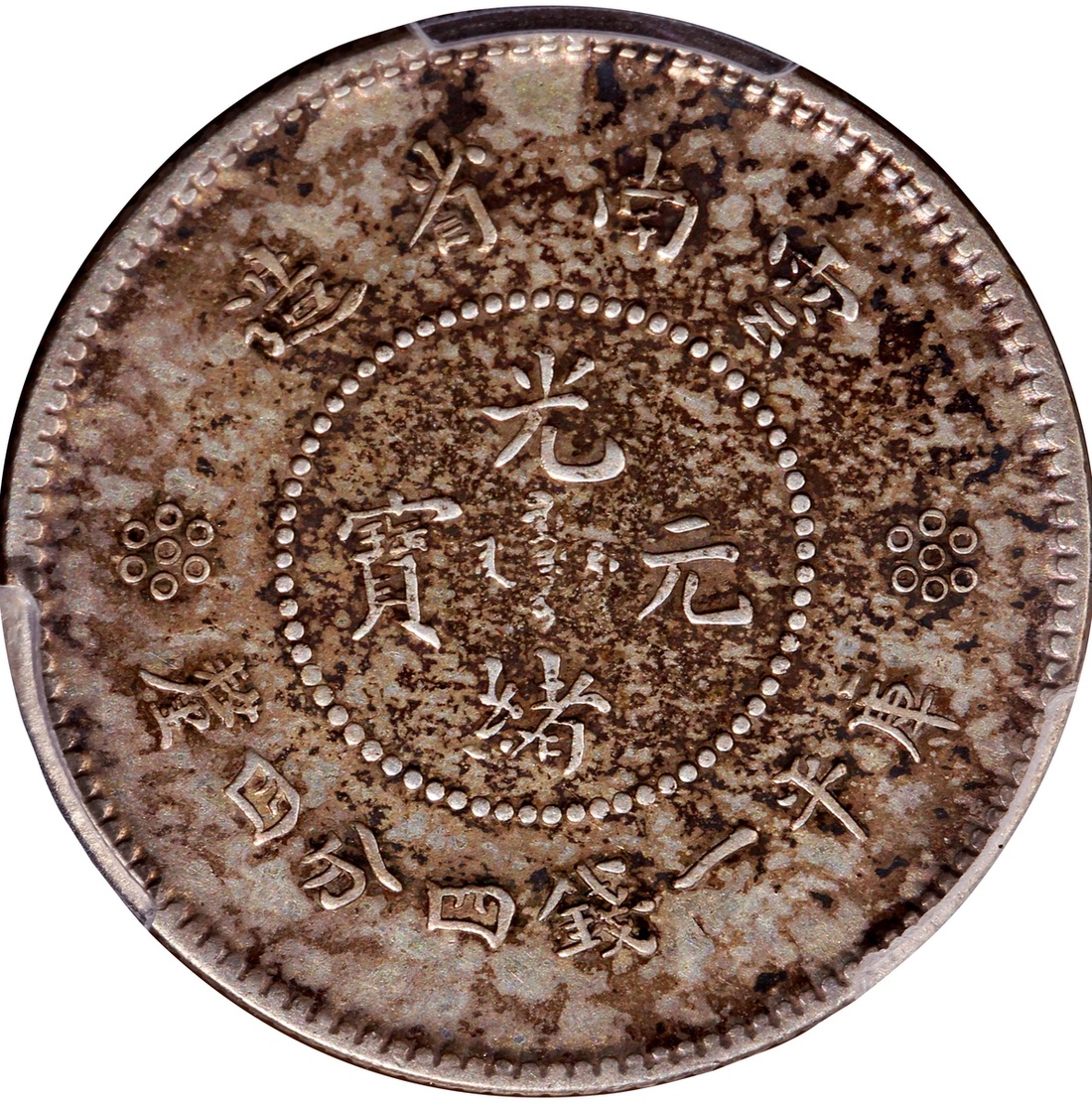 清代雲南光緒一錢四分四釐,新龍,三圈版,深色包漿,PCGS AU,有清洗,編號42058017