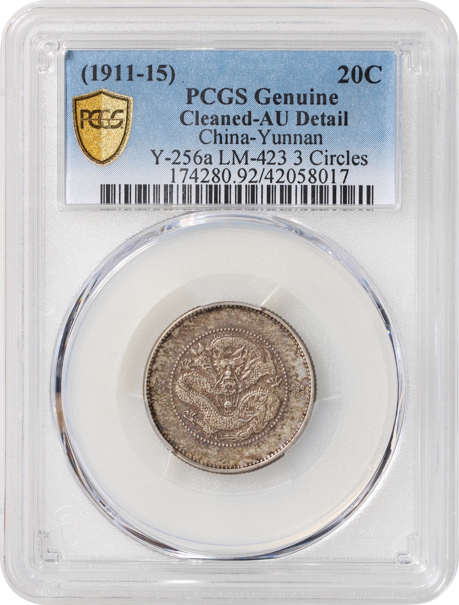 Yunnan Province, silver 20 cents, Guangxu Yuan Bao, new dragon, (LM-423), dark toned, 3 circles variant, PCGS AU Detail, cleaned. #42058017
