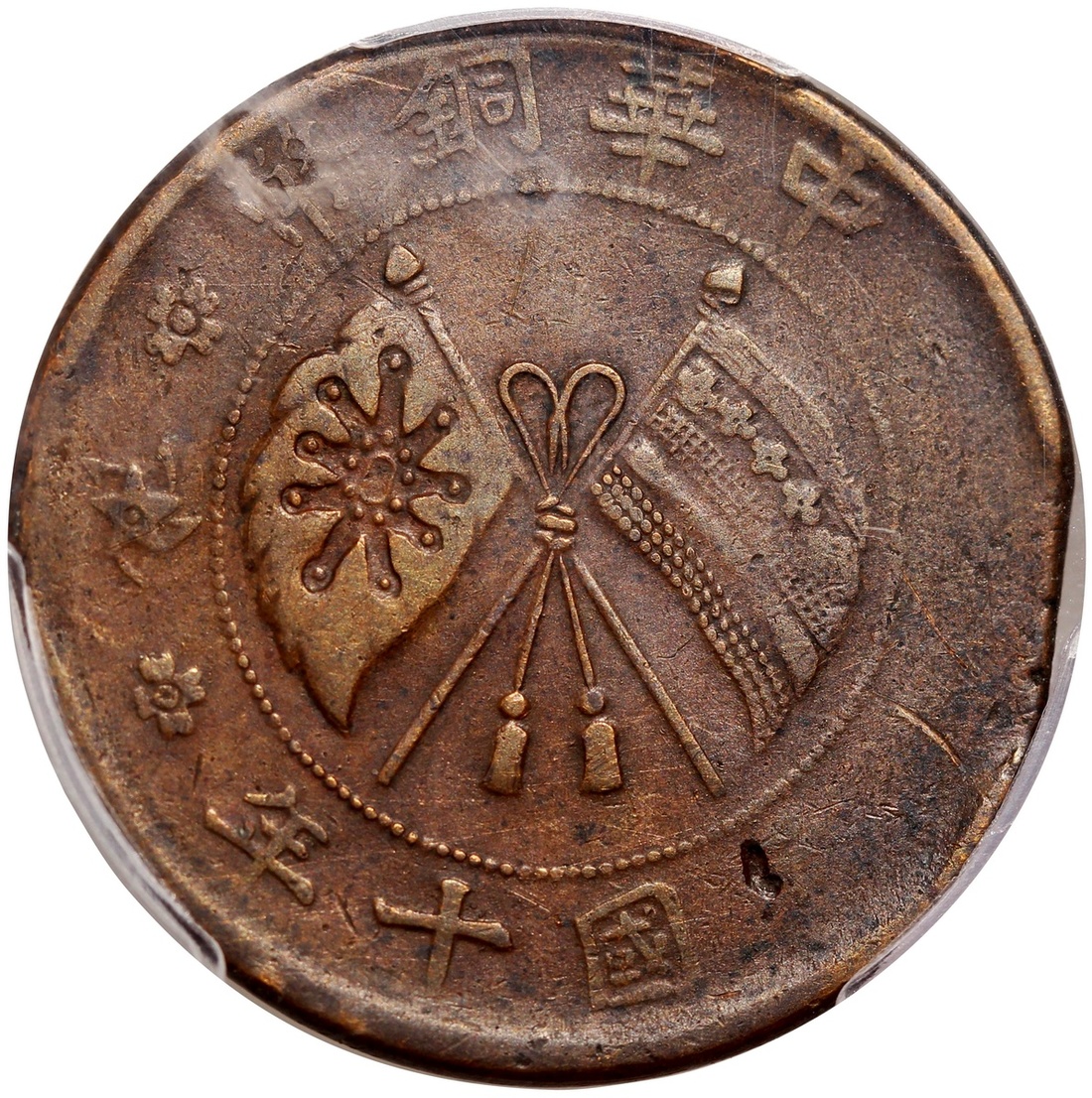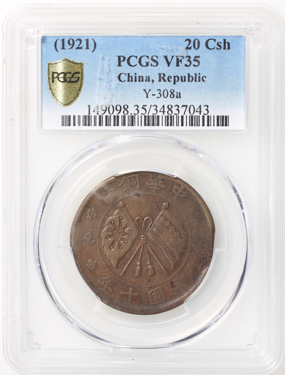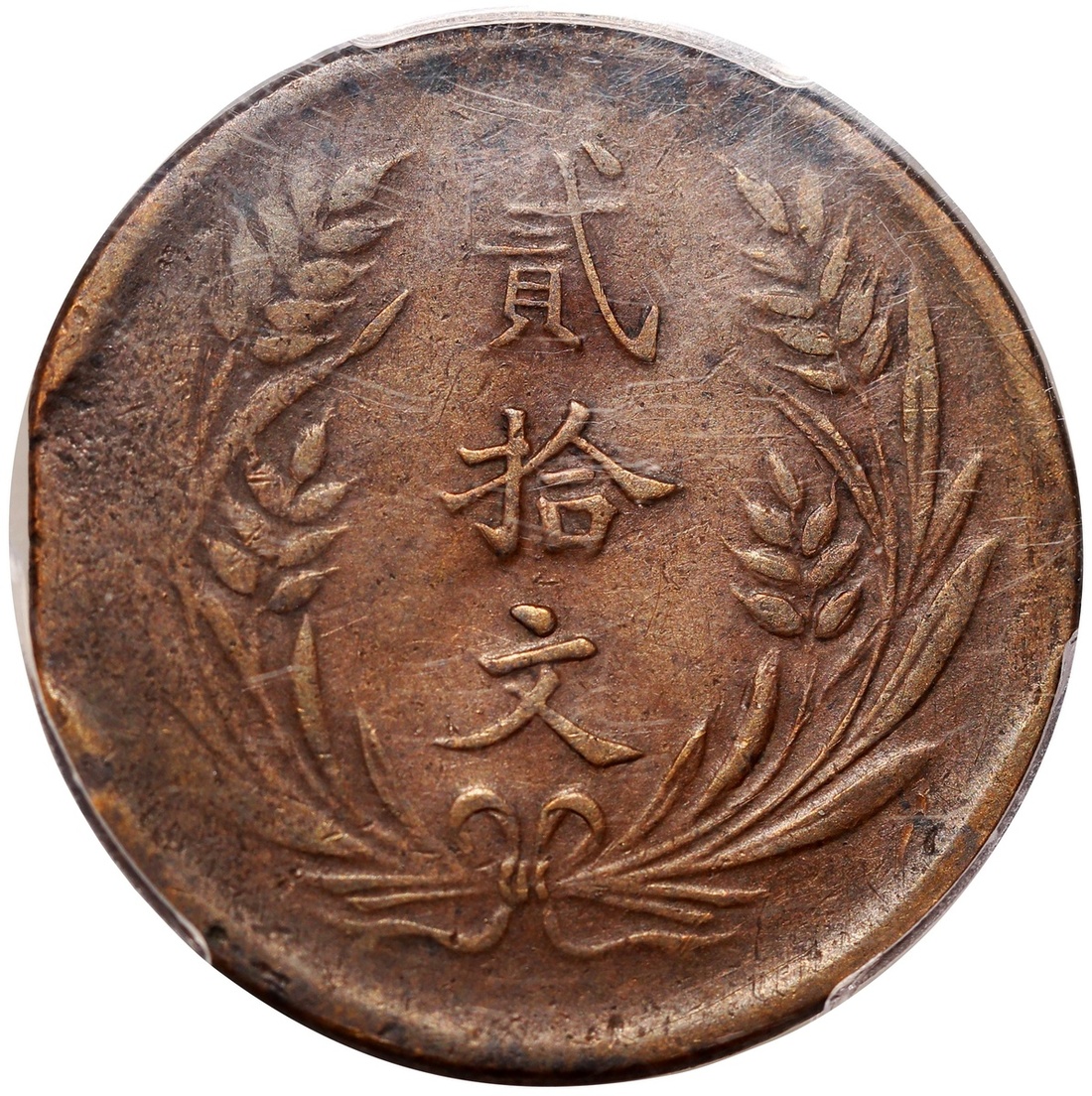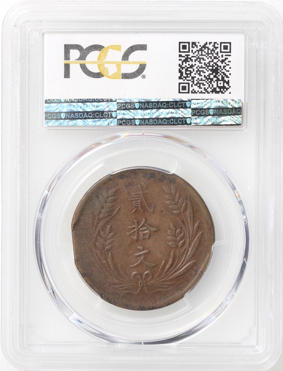 蒙古二十文銅幣,正面交叉旗幟,3點鐘位置輕微修剪,PCGS VF35