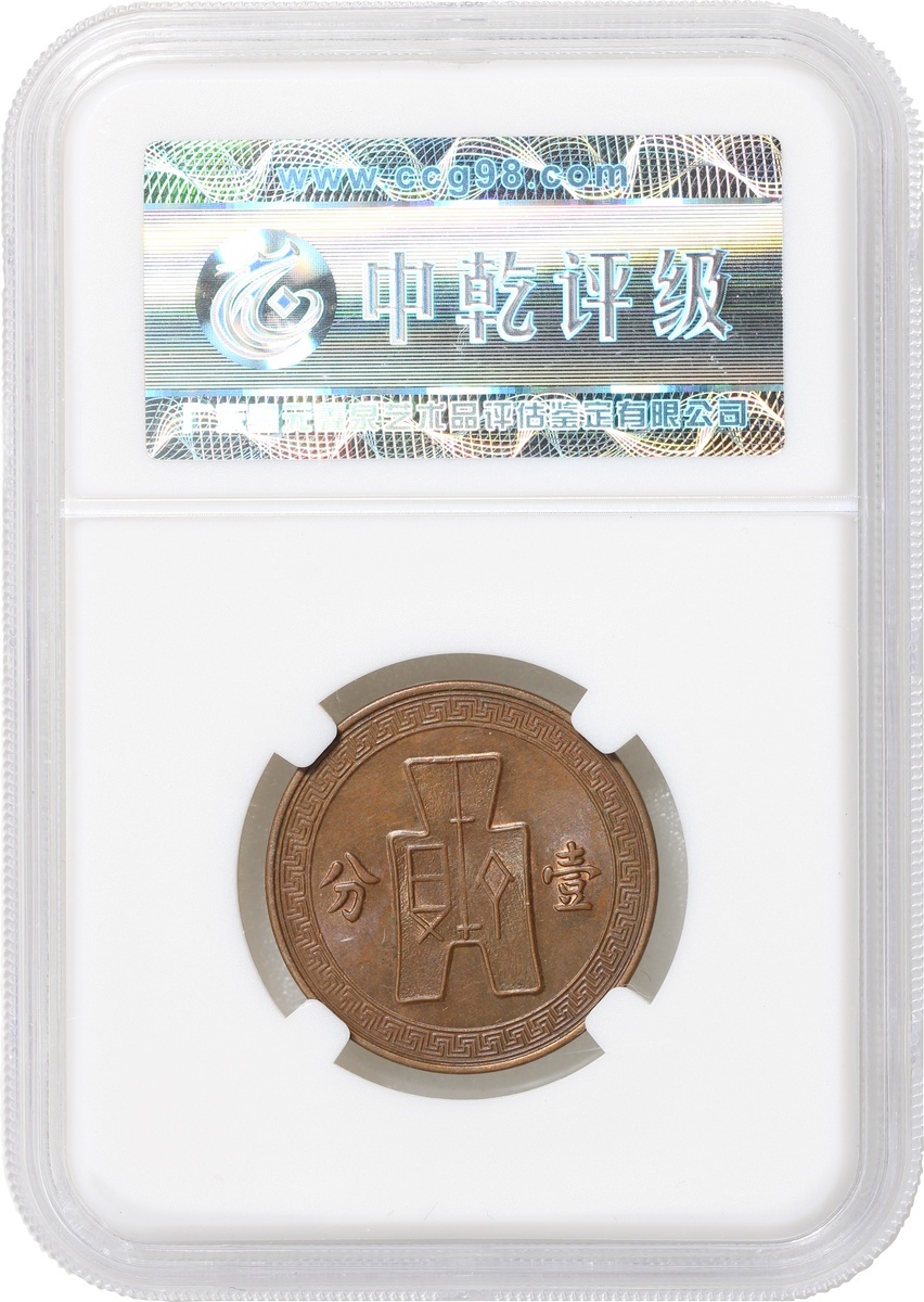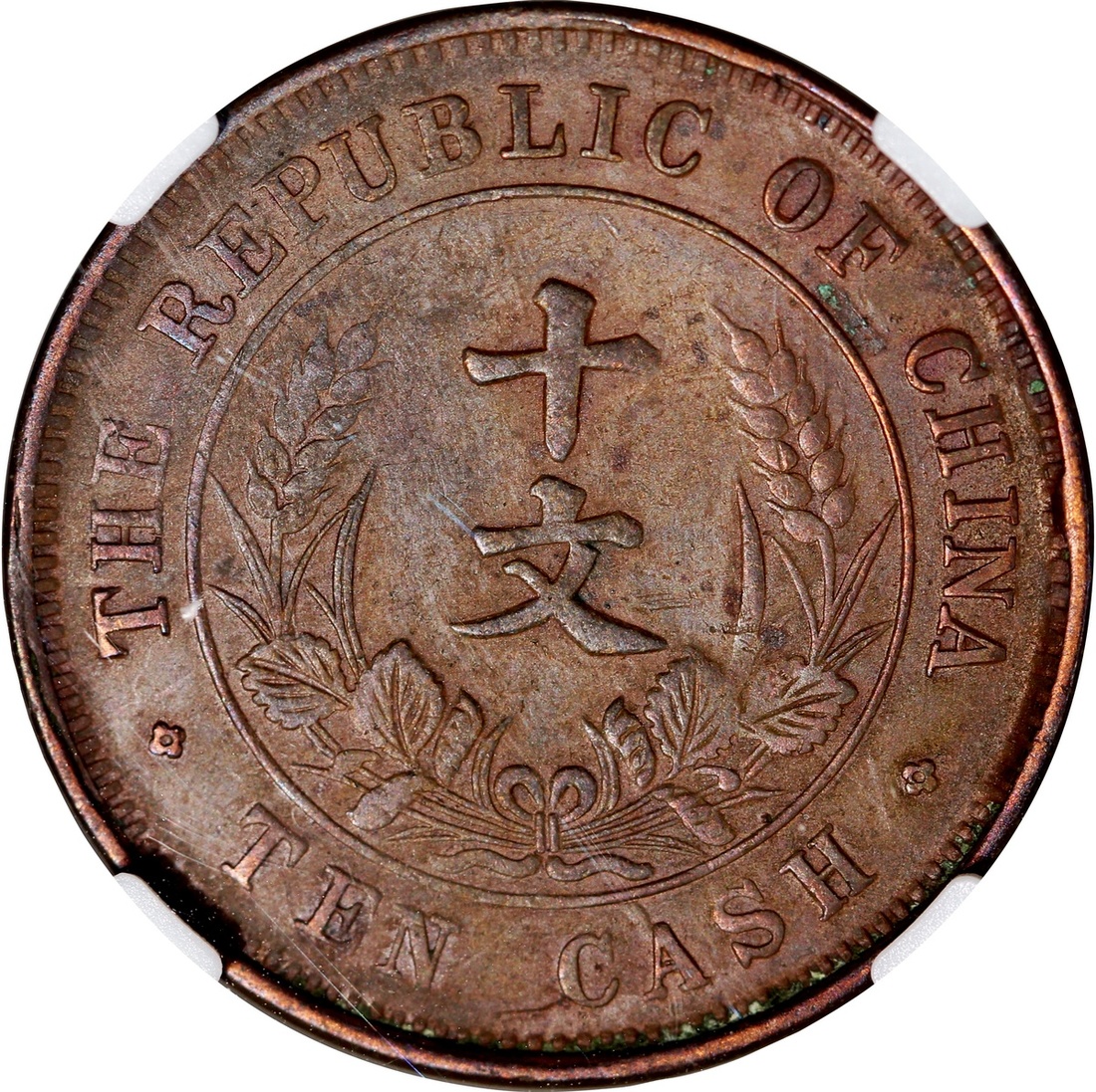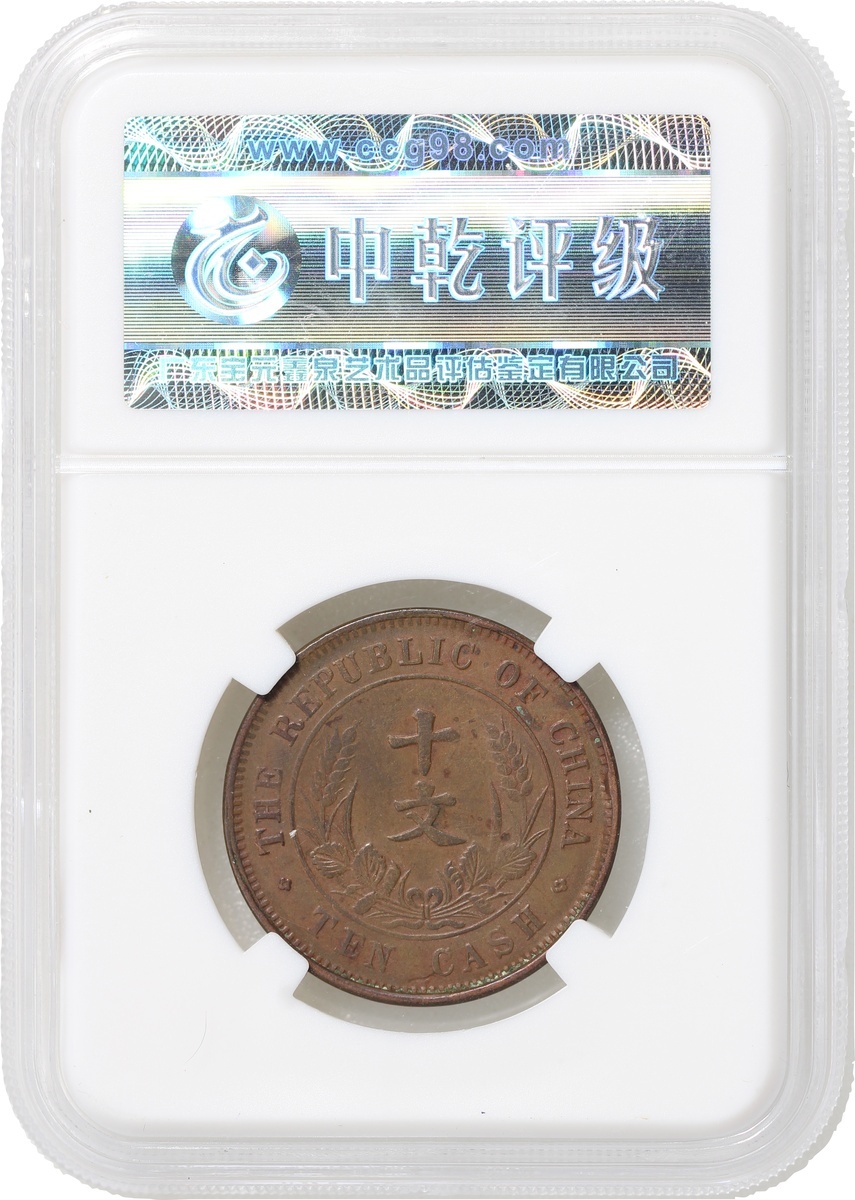 Republic of China, copper 10 cash, ND (1920), 'Memento', crossed flags at obverse, and copper 1 fen, 1936, 'Bu' coin at obverse, graded Zhong Qian MS60 and MS62+BN respectively (2)