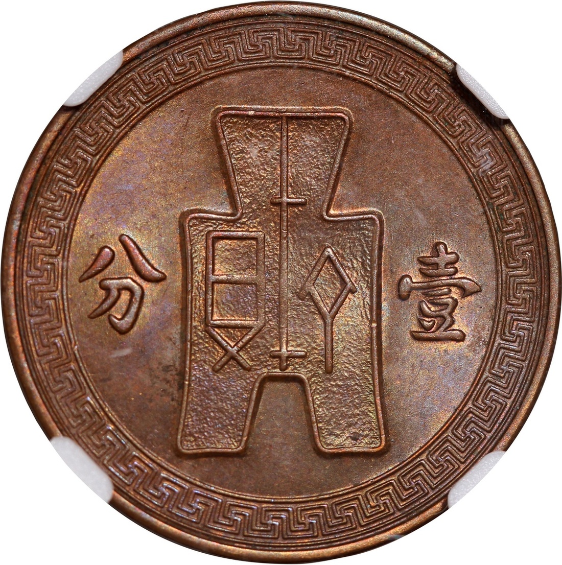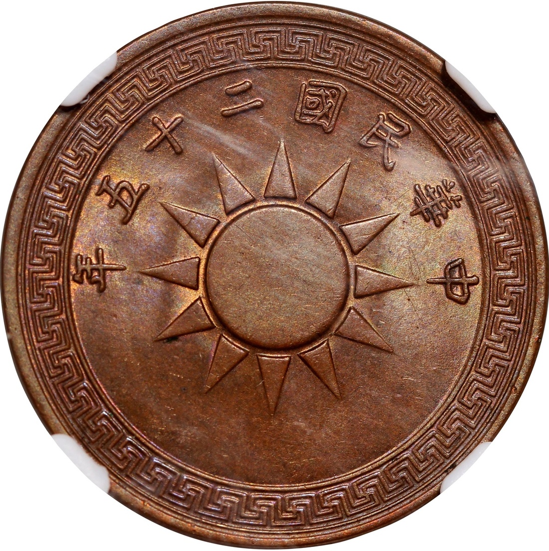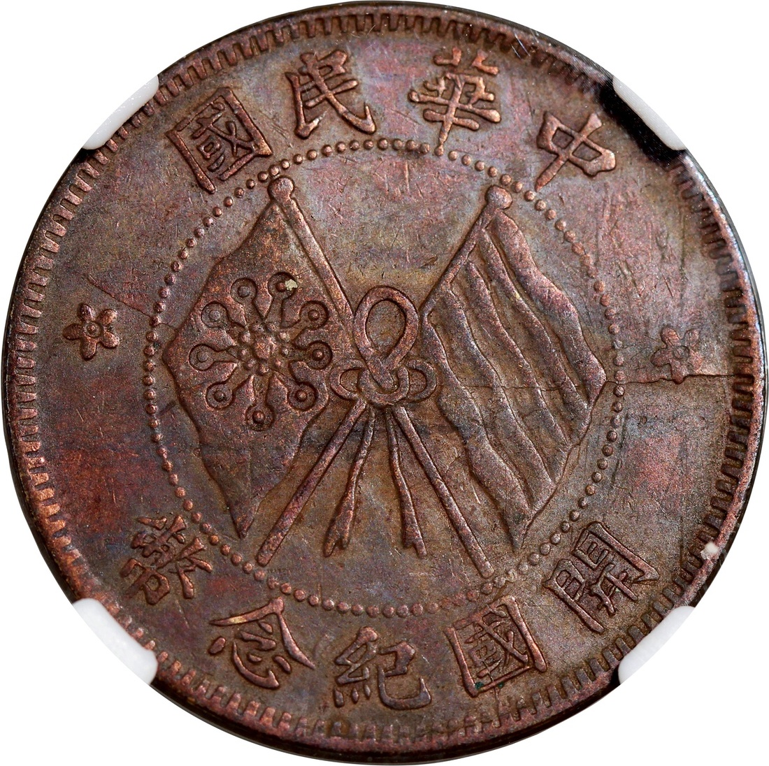 Republic of China, copper 10 cash, ND (1920), 'Memento', crossed flags at obverse, and copper 1 fen, 1936, 'Bu' coin at obverse, graded Zhong Qian MS60 and MS62+BN respectively (2)