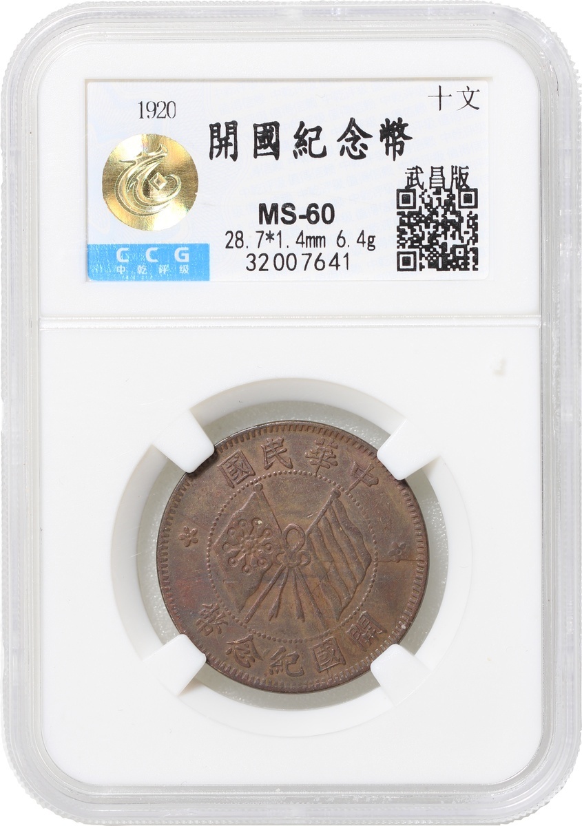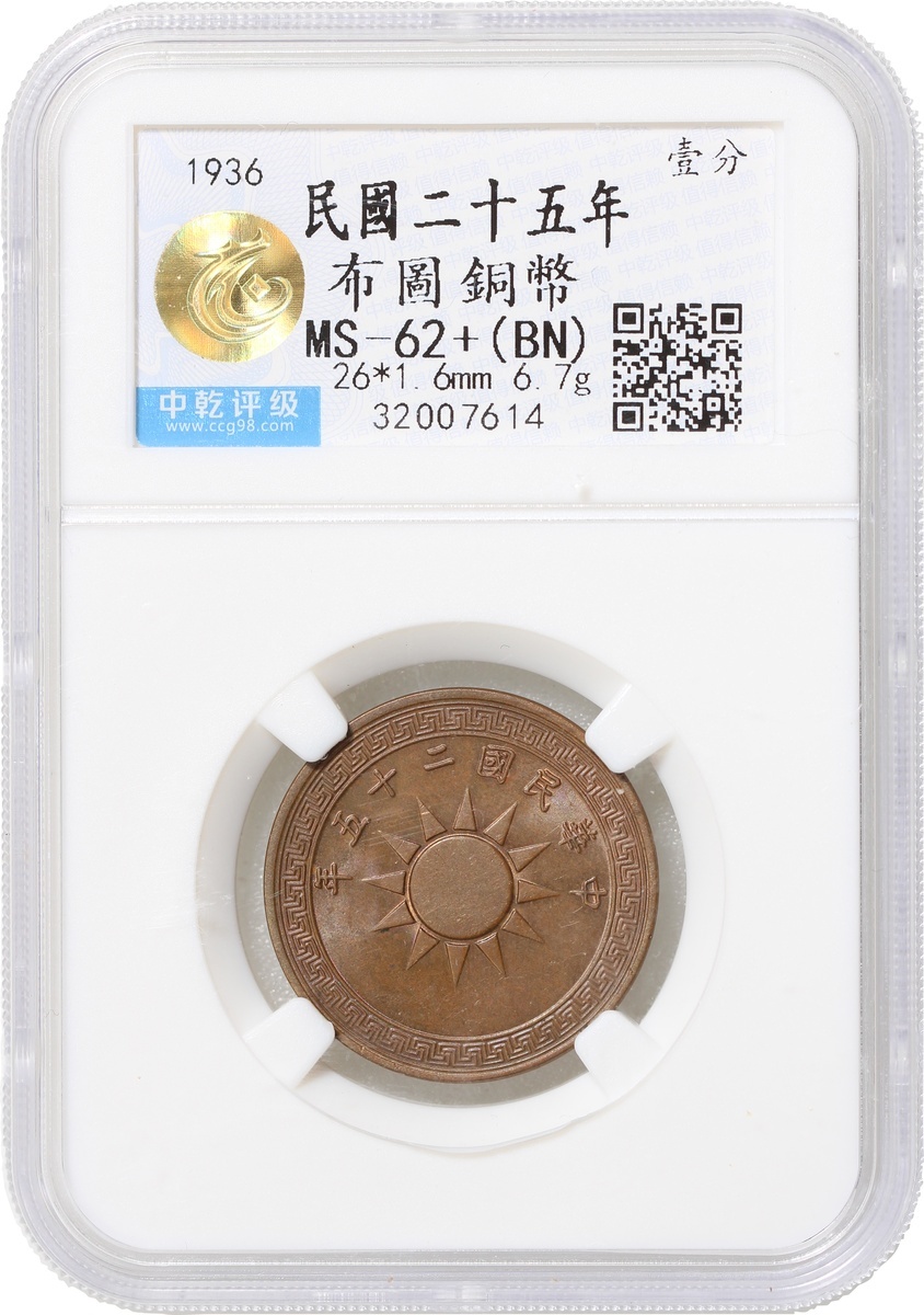 銅幣一組2枚,一枚為開國紀念十文銅幣,正面交叉雙旗,另一枚為民國25年黨徽布圖壹分,均經中乾評級MS60及MS62+