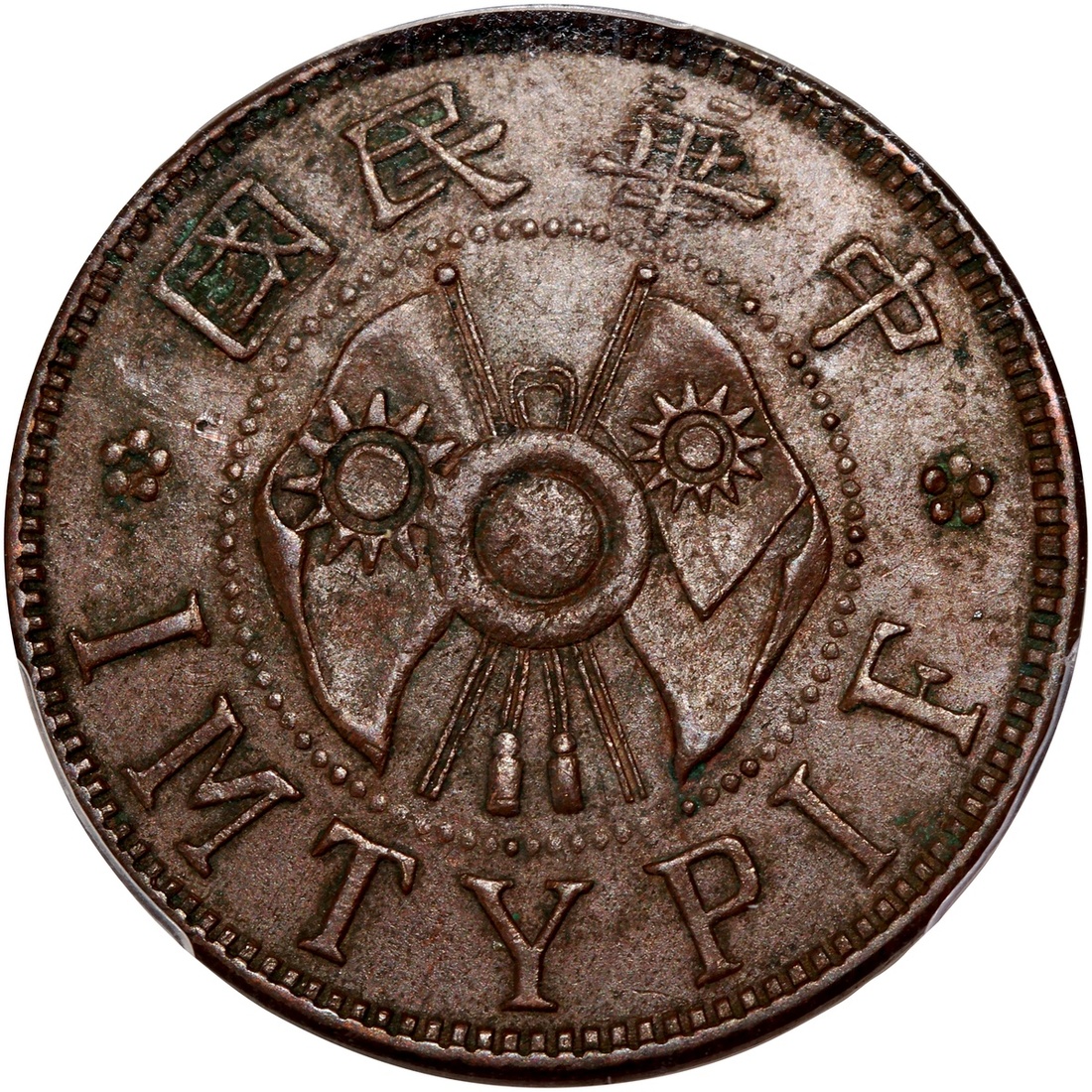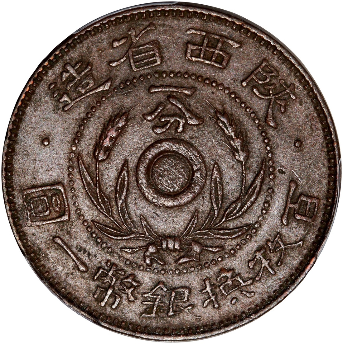 Shensi Province, copper 1 cent, no date (1928), grain wreath on obverse and crossed flags on reverse,