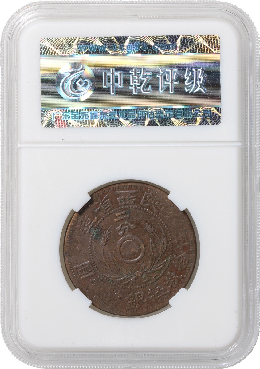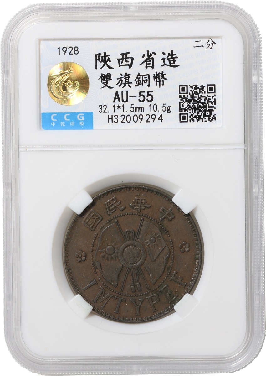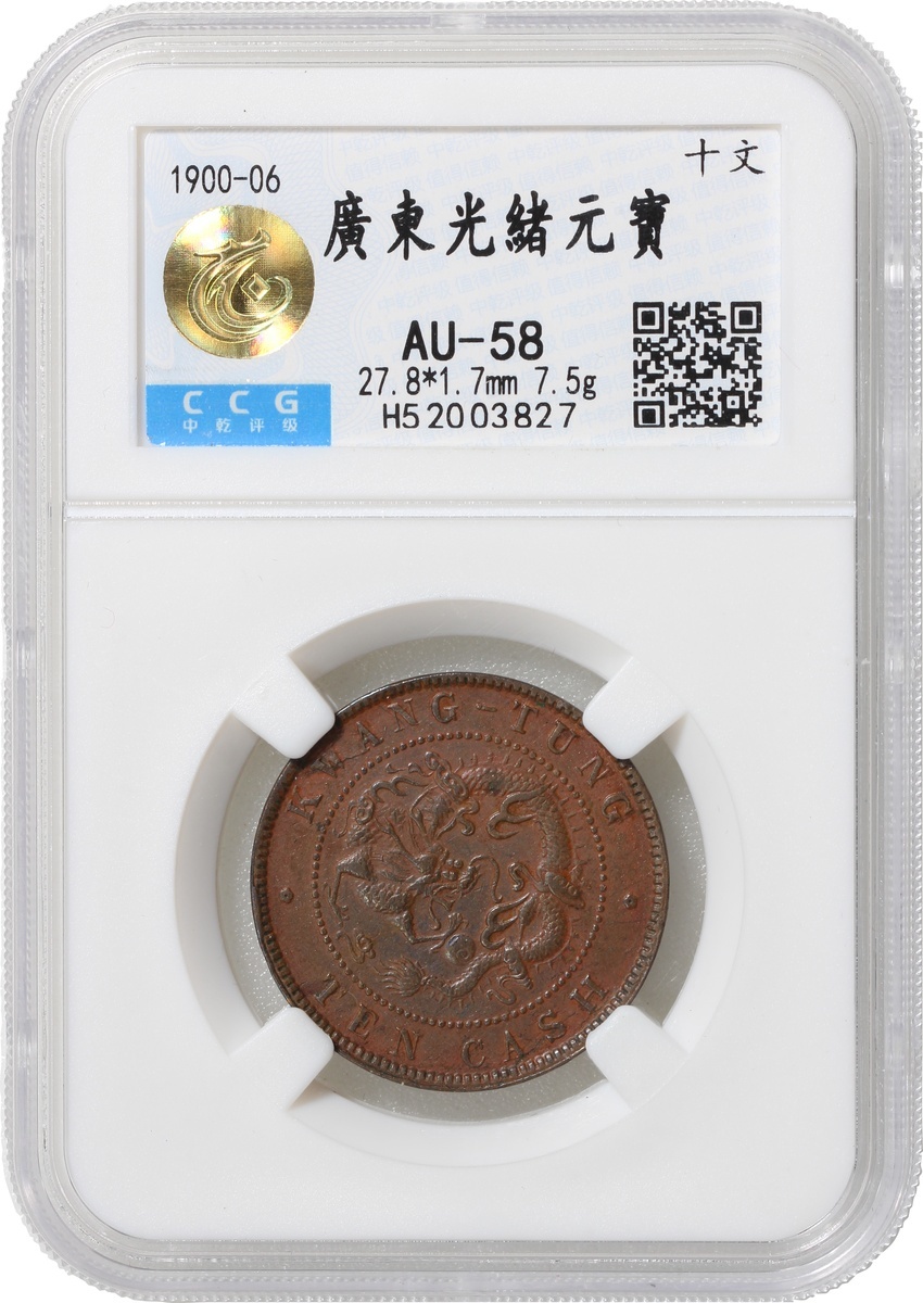 中國銅幣一組3枚,包括1900-1906年廣東省造光緒元寶十文,以及1928年陝西嘉禾雙旗二分2枚,分別中乾AU58,XF及AU55
