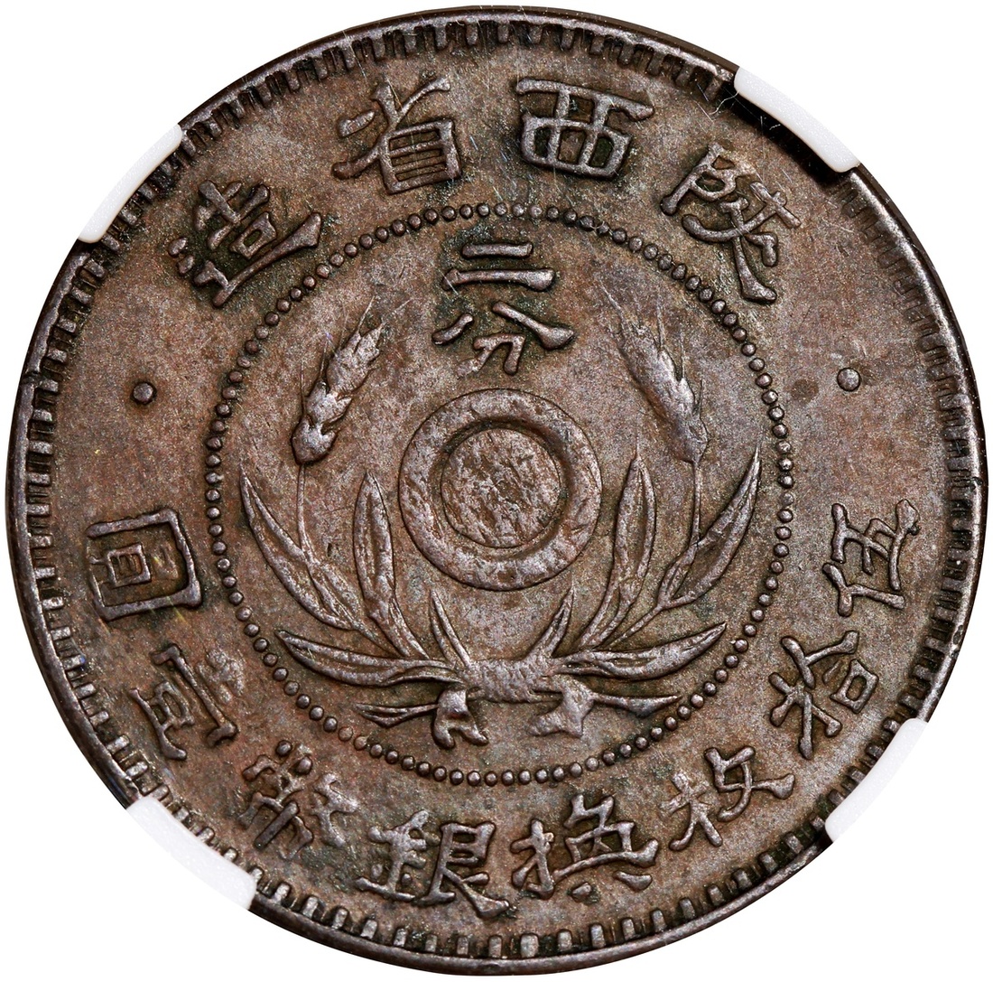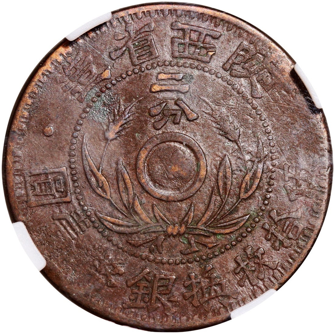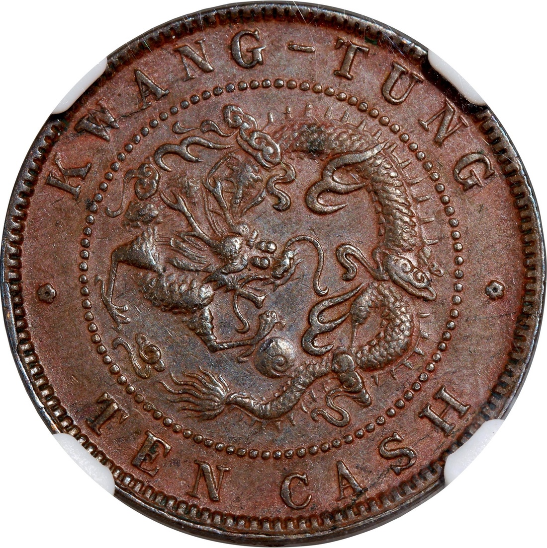 中國銅幣一組3枚,包括1900-1906年廣東省造光緒元寶十文,以及1928年陝西嘉禾雙旗二分2枚,分別中乾AU58,XF及AU55