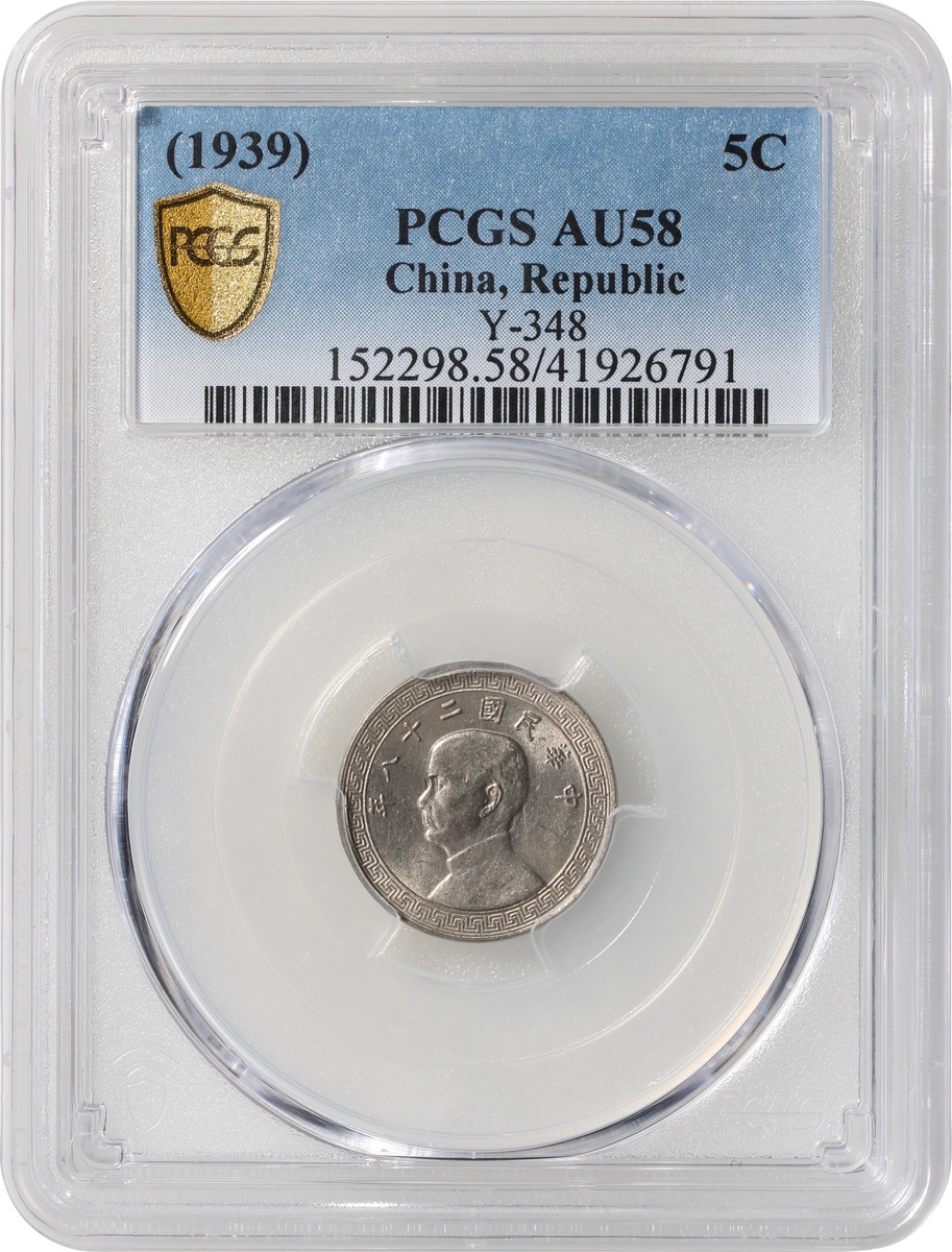 China, Republic, nickel 5 cents, 1939, (Y-348), PCGS AU58. #41926791
