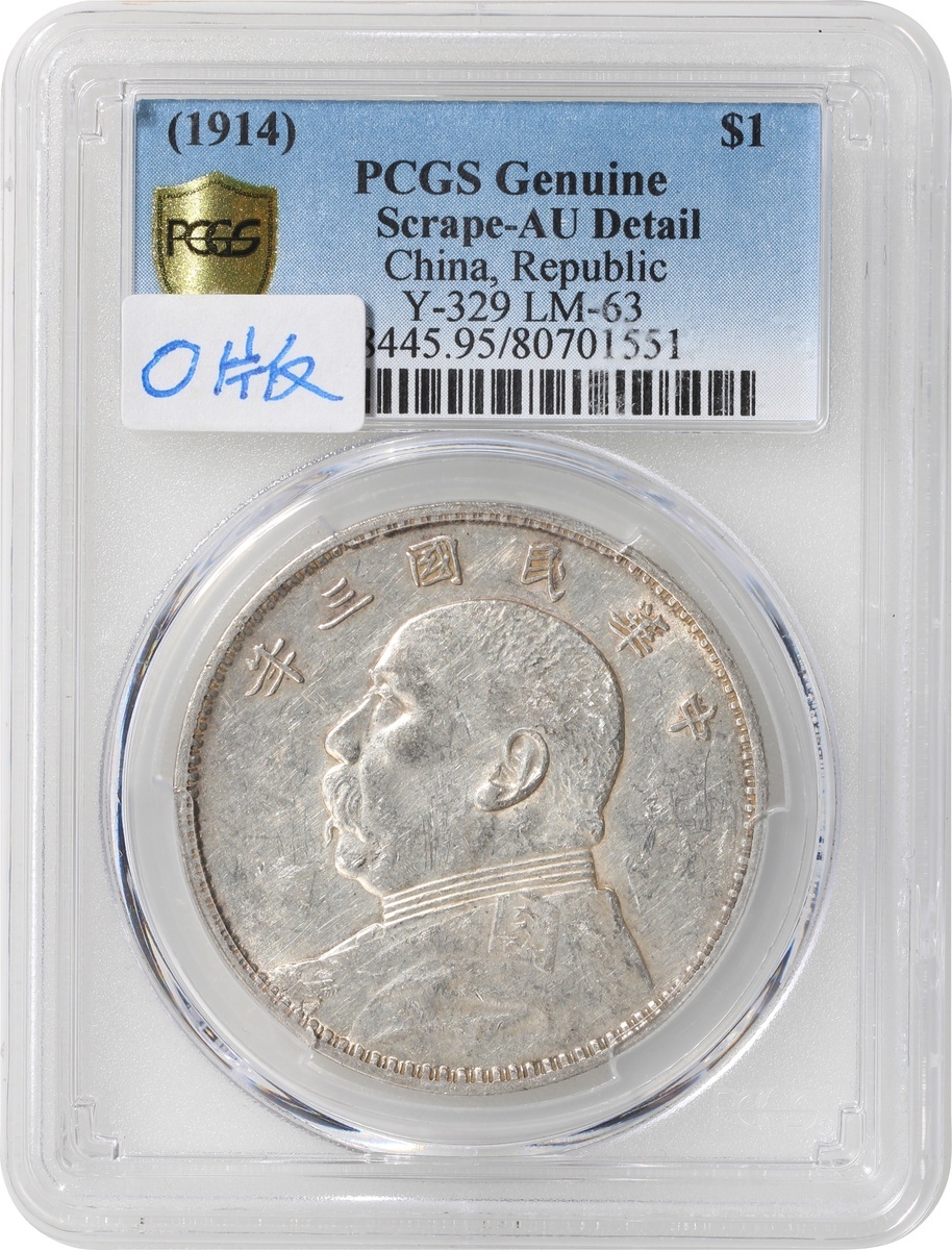 China, Republic, silver $1, Year 3(1914-O), Yuan Shih Kai dollar, small circlet in riband on reverse, (LM-63), PCGS AU Detail, scrape. #80701551