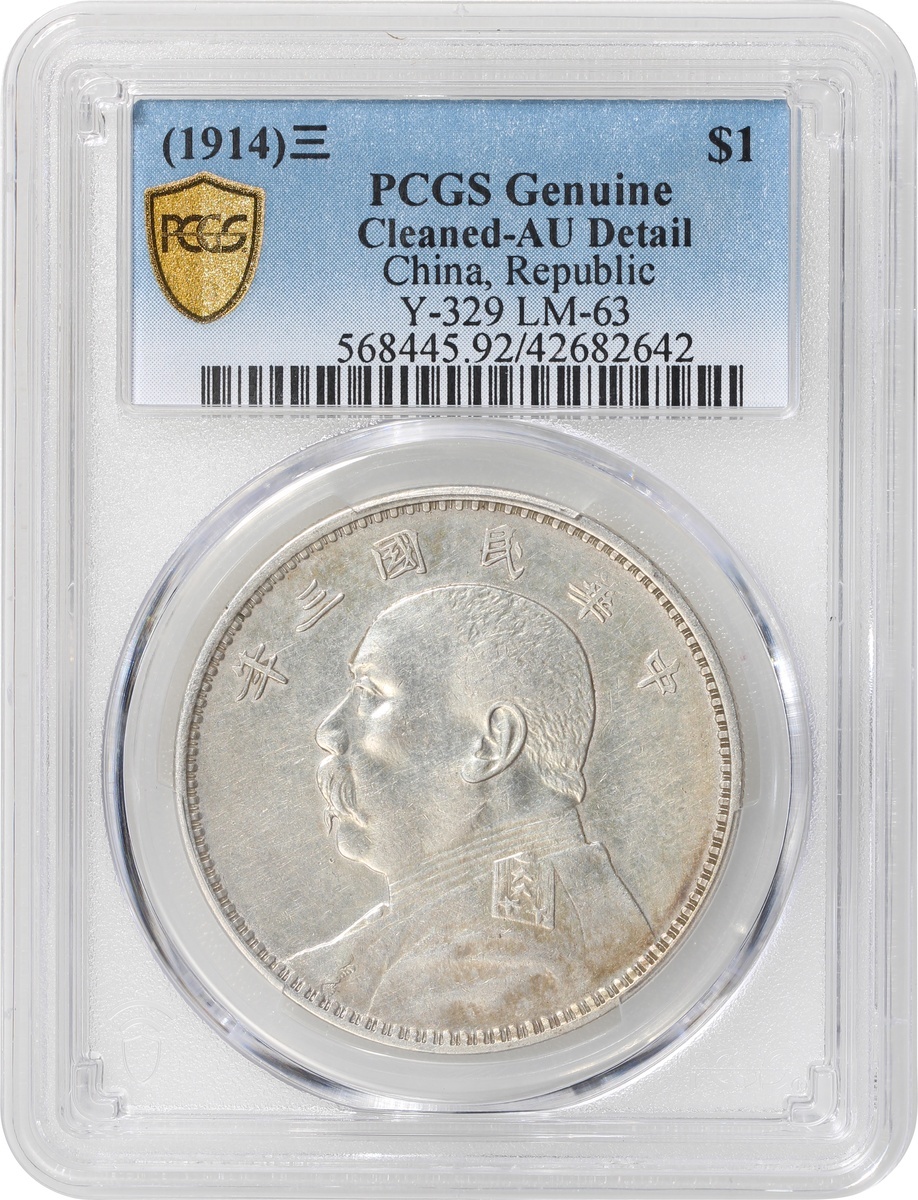 Republic of China, silver $1, Year 3 (1914), Yuan Shih Kai, (Y-329, LM-63), PCGS Genuine Cleaned - AU Detail, #42682642.