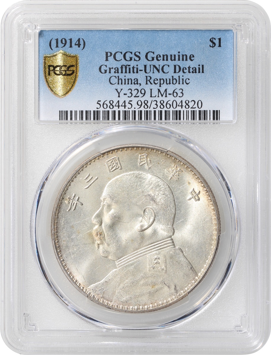 China, Republic, silver $1, Year 3(1914), Yuan Shih Kai dollar, (LM-63), PCGS UNC Detail, graffiti. #38604820