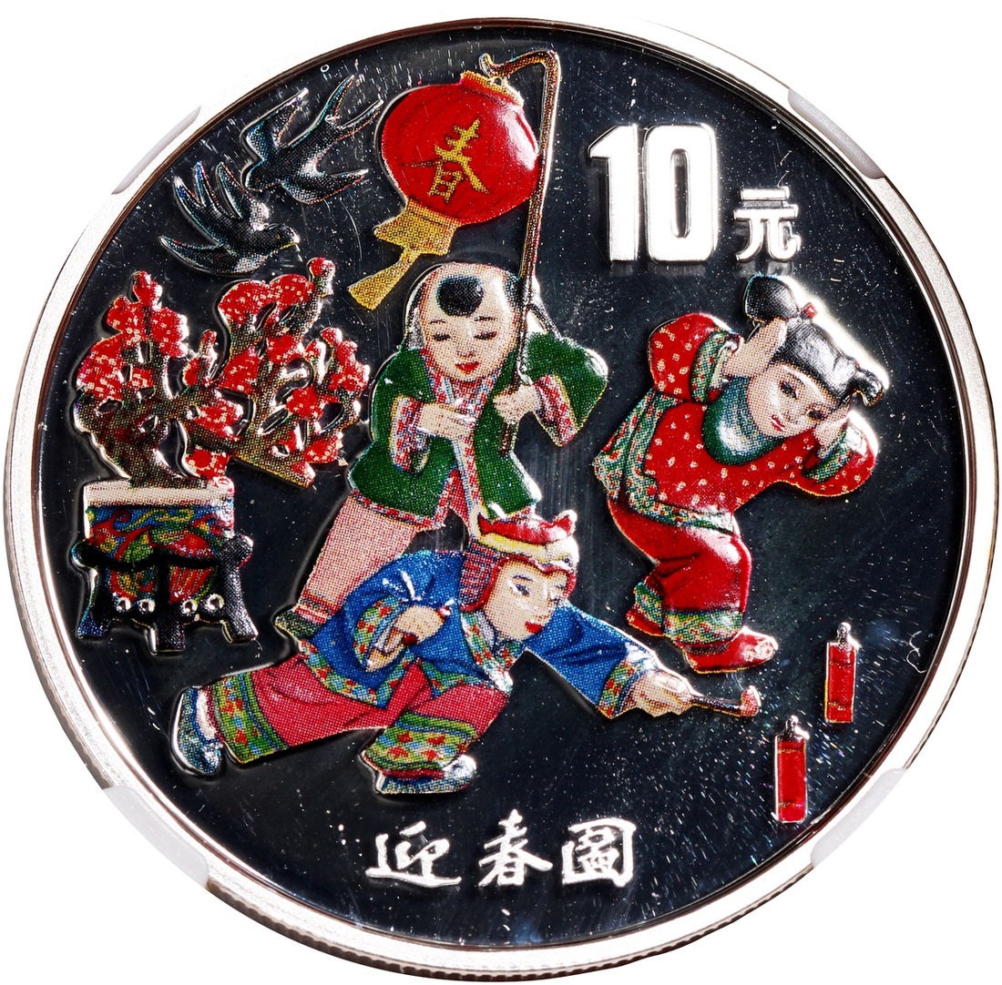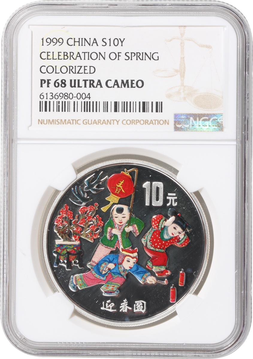 1999年中國「迎春圖」彩色精鑄銀幣10元,重1盎司,NGC PF68 Ultra Cameo,#6136980-004
