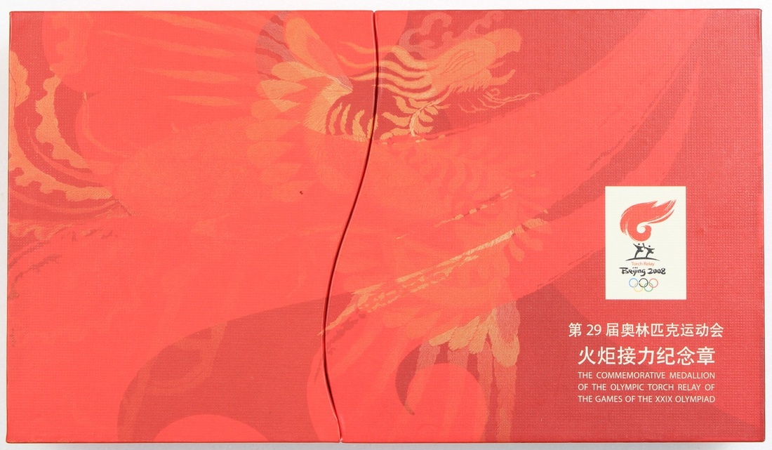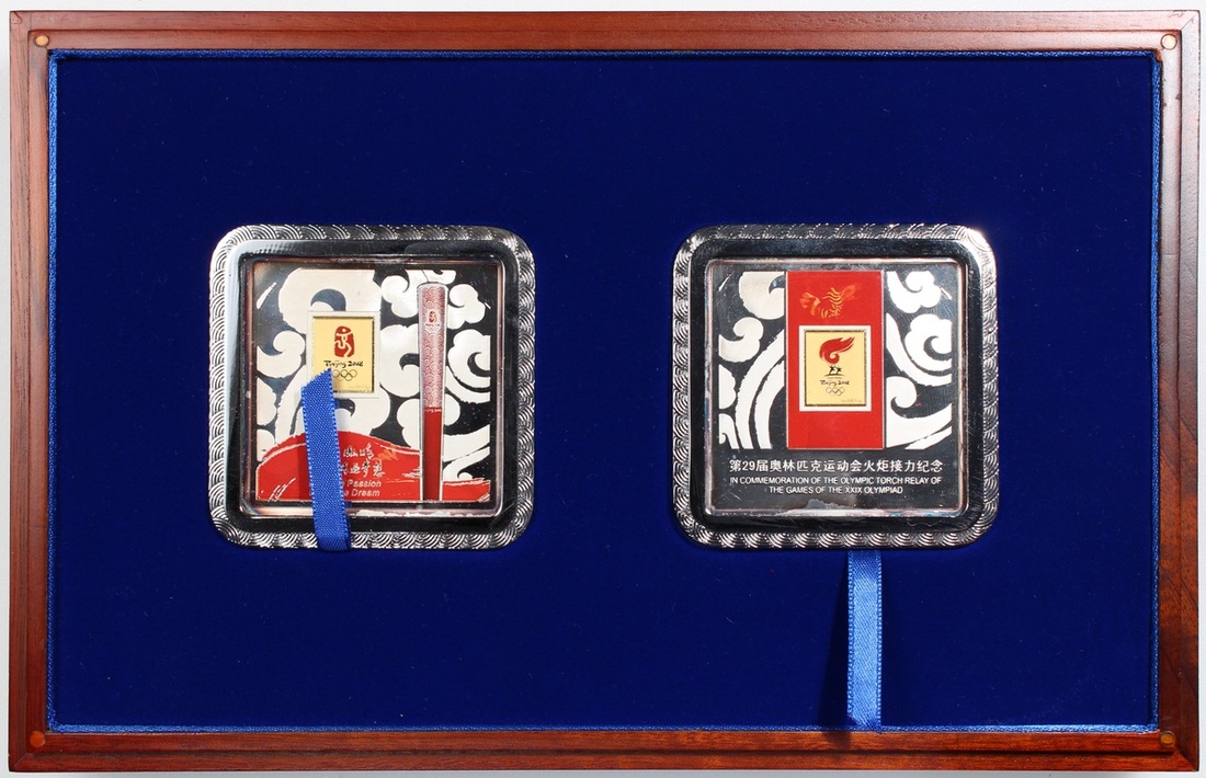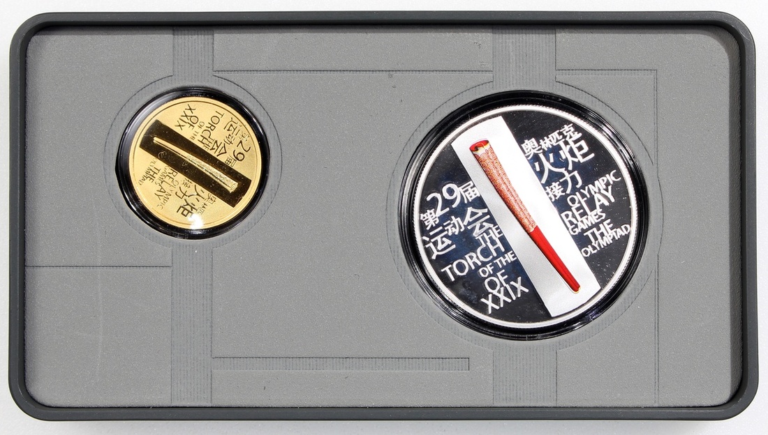 第29屆奧林匹克運動會火炬接力紀念章一組2枚,包括1/4盎司金章及1盎司銀章,