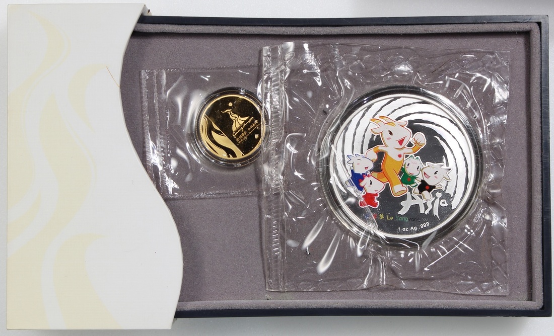 廣州2010年亞洲運動會吉祥物紀念1/10盎司金章及1士盎司彩銀章一對,
