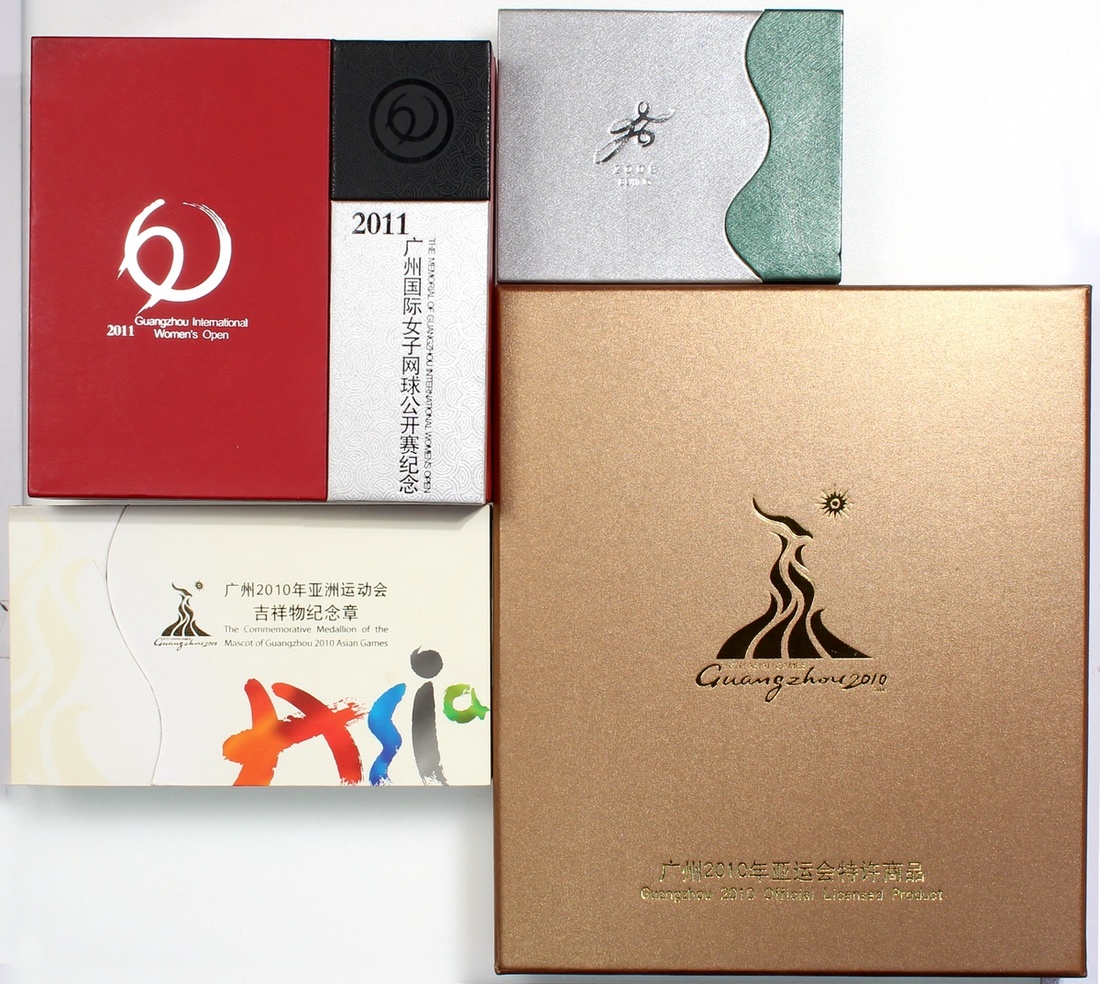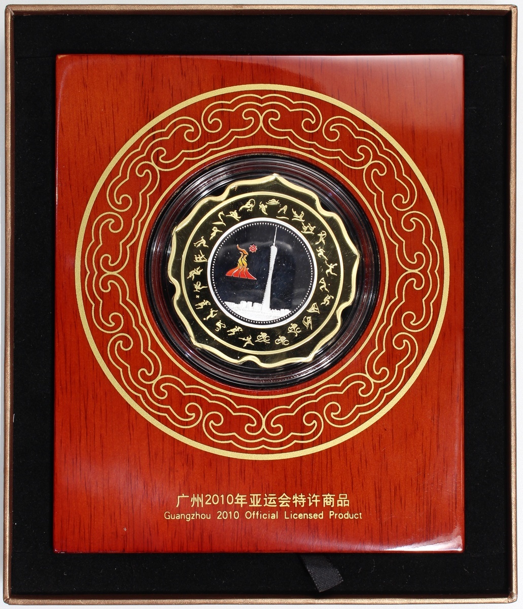 People's Republic of China, 4 commemorative sets, consisting of: Guangzhou 2010 Asian Games, 1 set of gold 1/10oz medal and coloured silver 1oz medal, both of .999 fineness, and 1x gold and nickel plated copper medal, measures 72mm in diameter,