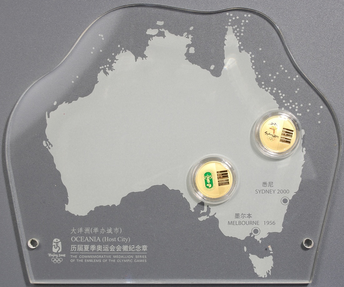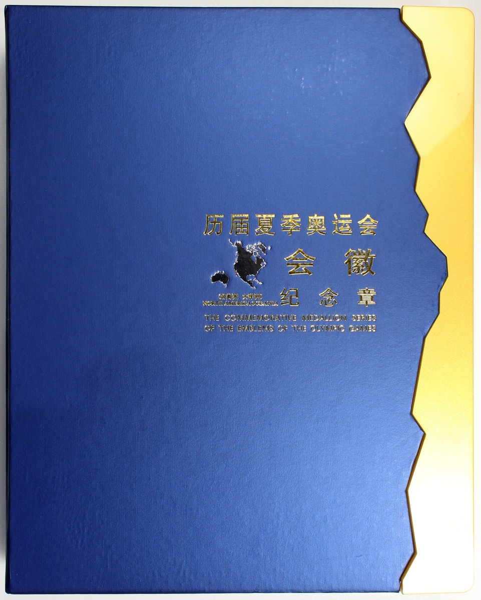 2007年中國「歷屆夏季奧運會吉祥物紀念章」及「歷屆夏季奧運會會徽紀念章」2組,前者包括8枚彩金幣,各1/10安士,0.999金,後者包括6枚彩銀章,各1/2安士,0.999銀,總含金0.8安士及含銀3安士,均proof FDC,連原盒及證書,編號01498(金)及01882(銀),前者發行量20000套,後者50000套