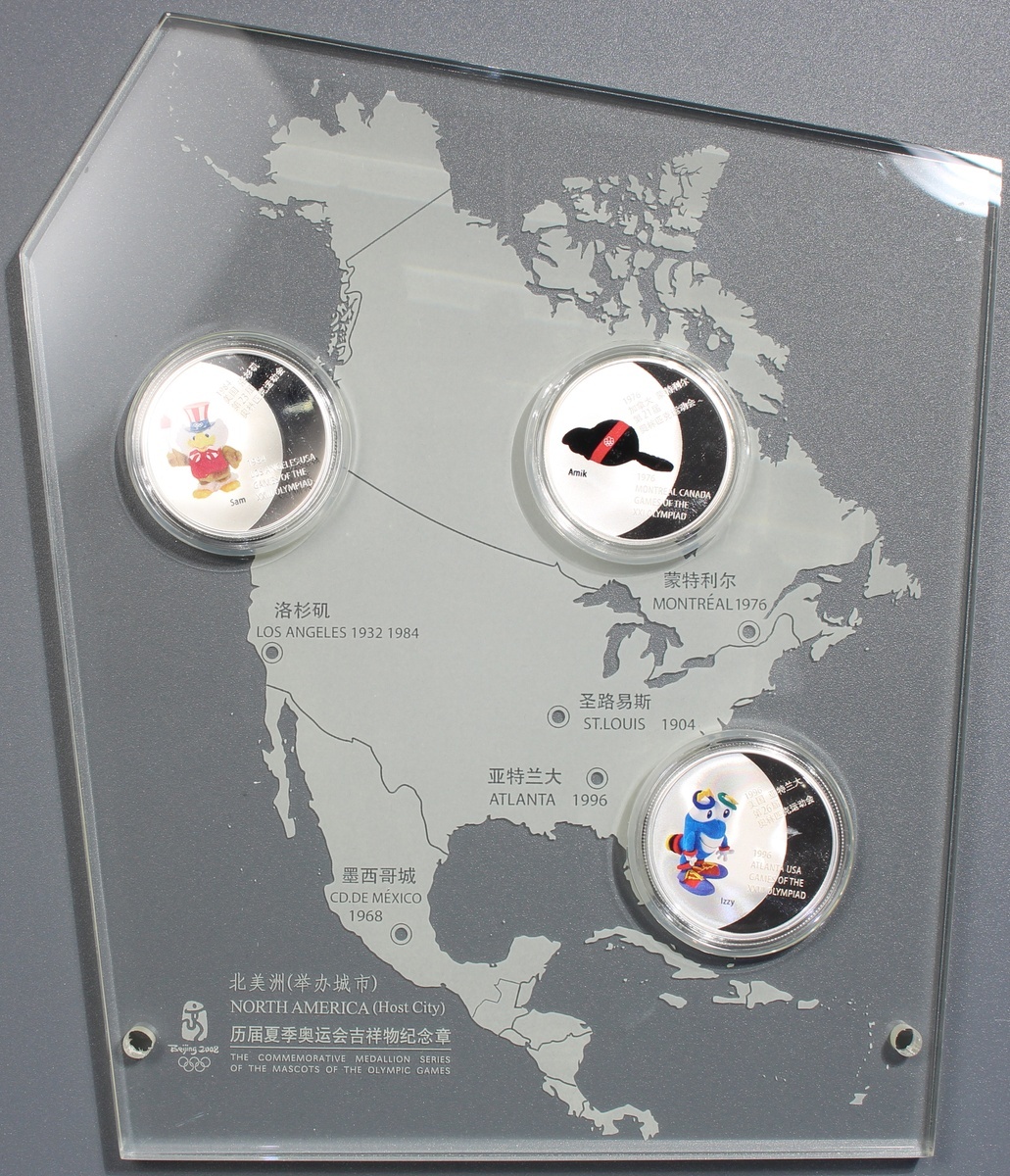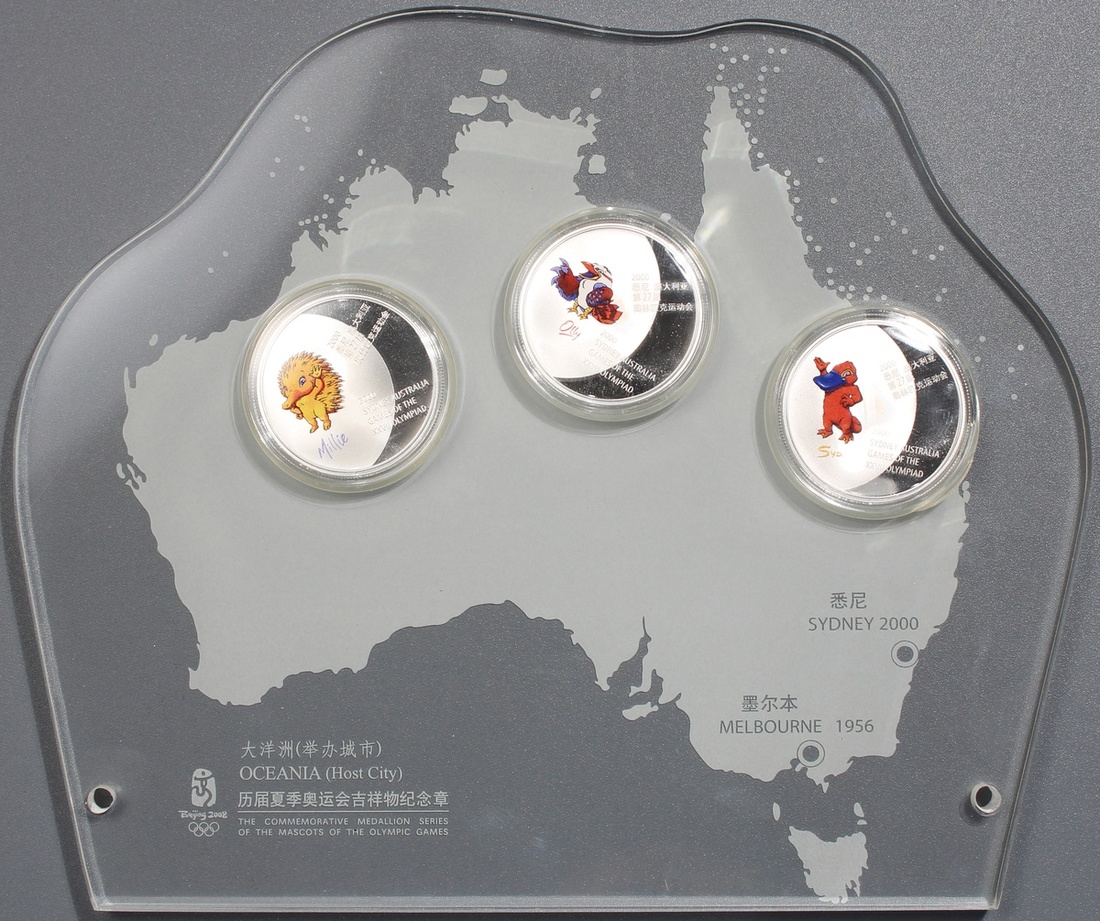 People's Republic of China, two sets of The Commemorative Medallion Series of the Mascots of the Olympic Games: North-America-Oceania, 2008, the first set contains 8x coloured proof gold medallions, each weighs 1/10 oz containing .999 gold,