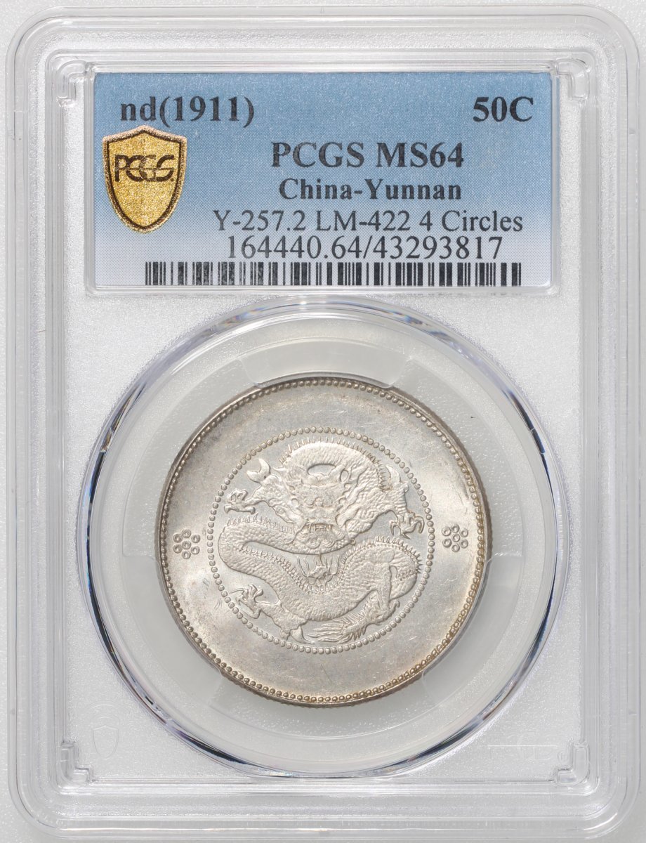 Yunnan Province, silver 50 cents, ND(1911), Guangxu Yuan Bao, new dragon, 4 circles, (LM-422), good luster, PCGS MS64. #43293817