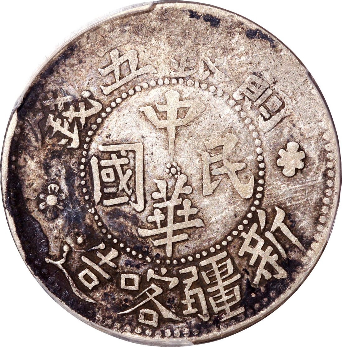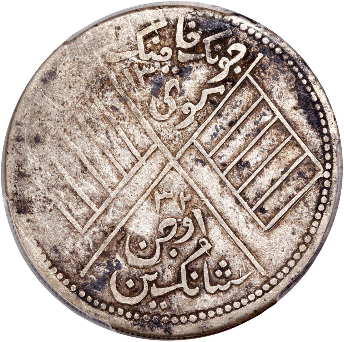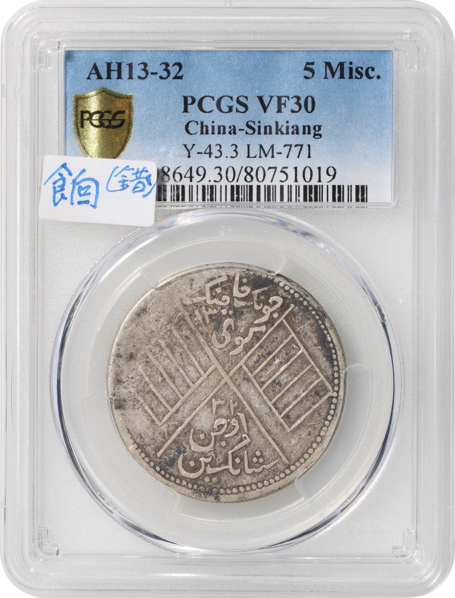 Sinkiang Province, silver 5 miscale, AH13-32, Kashgar, Xiangyin Wuqian, crossed flags on obverse, the Chinese character 'xiang' with extra stroke on reverse (LM-771), PCGS VF 30. #80751019