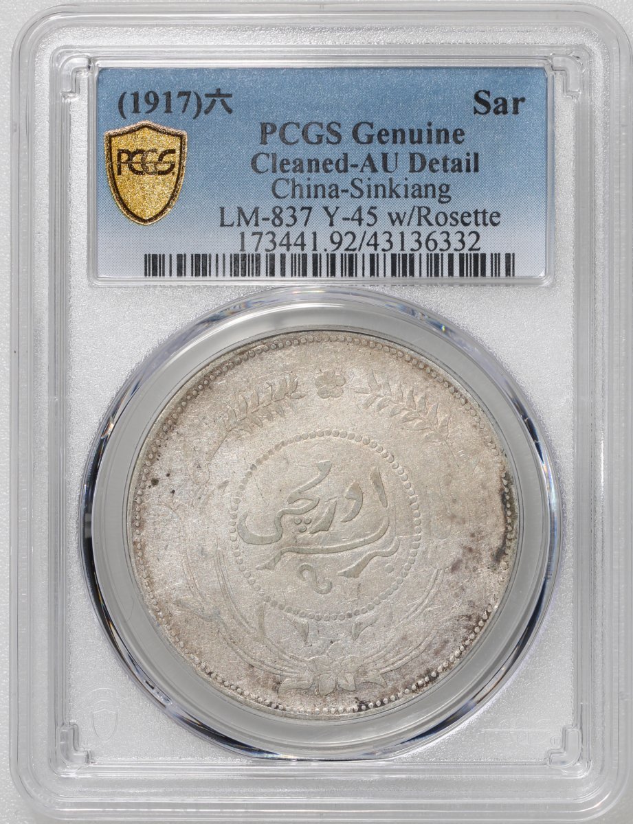 Sinkiang Province, silver 1 tael, Year 6(1917), Dihua mint, with rosette, (LM-837), PCGS AU Detail, cleaned. #43136332