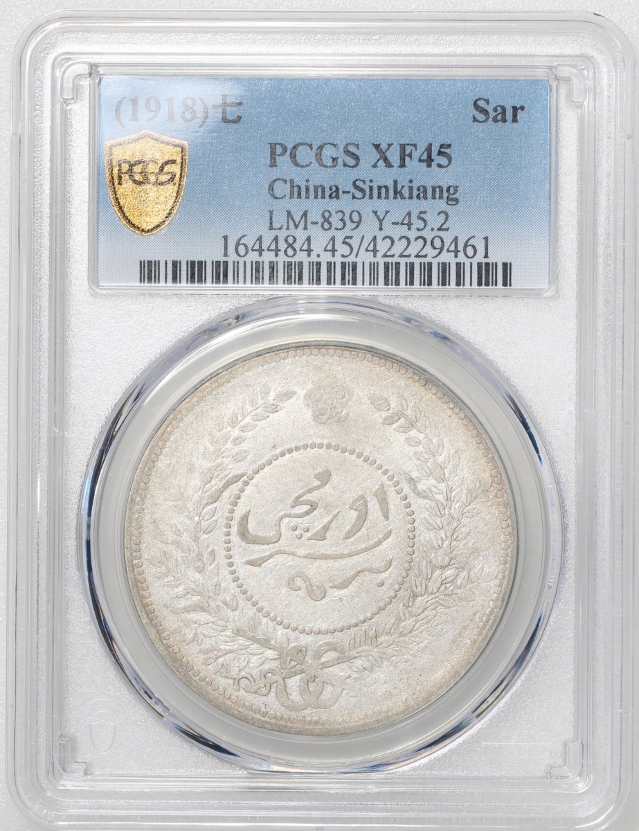 Sinkiang Province, silver 1 sar, Year 7(1918), Dihua Yinyuanju, (LM-839), with some luster, PCGS XF45. #42229461