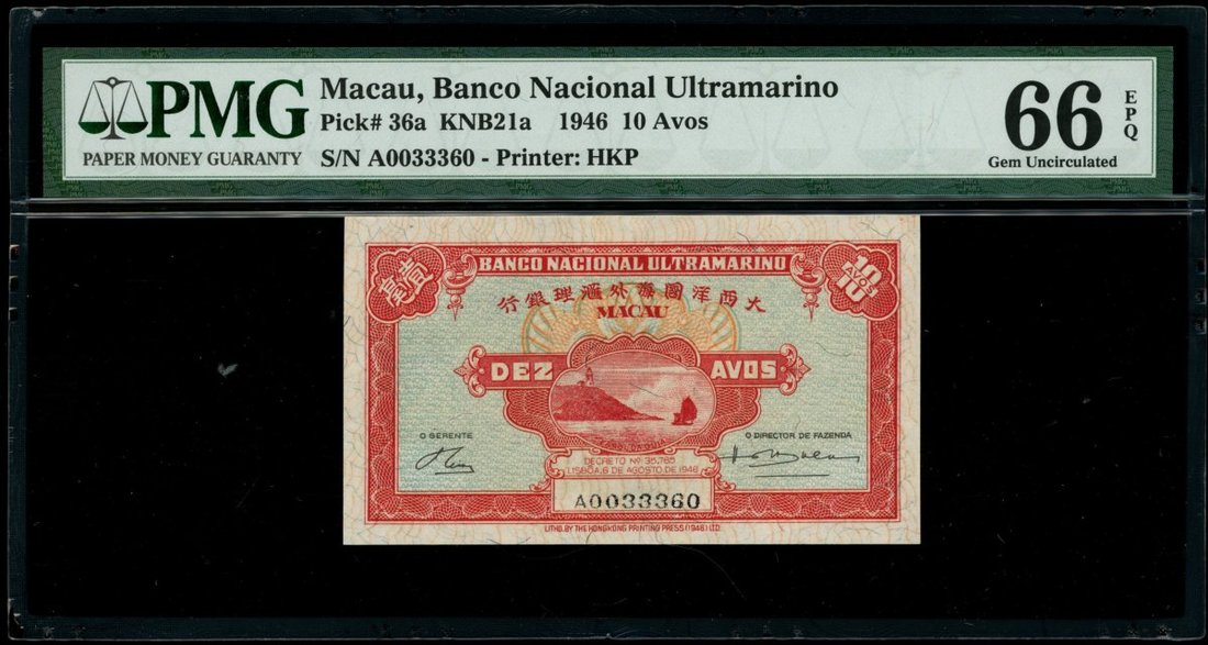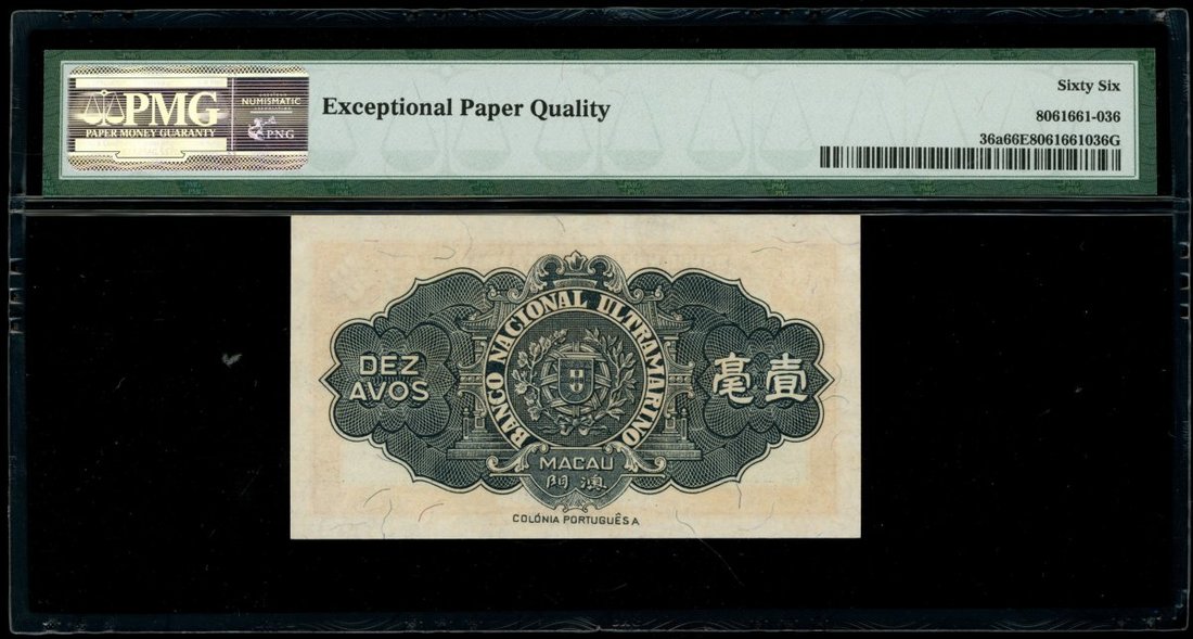 Macau, Banco Nacional Ultramarino, 10 avos, 6.8.1946, serial number A0033360, (Pick 36a), PMG 66EPQ Gem Uncirculated and scarce