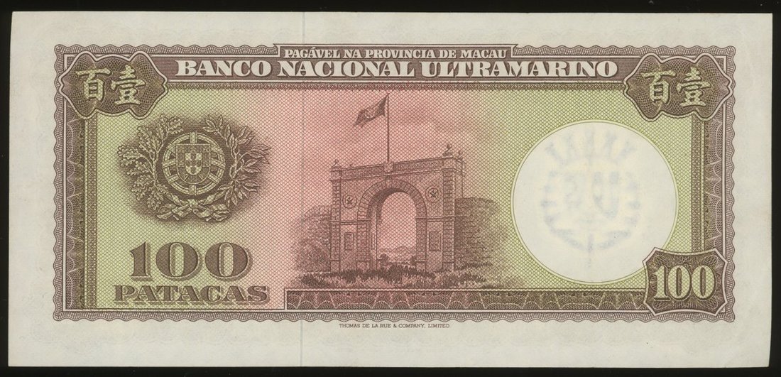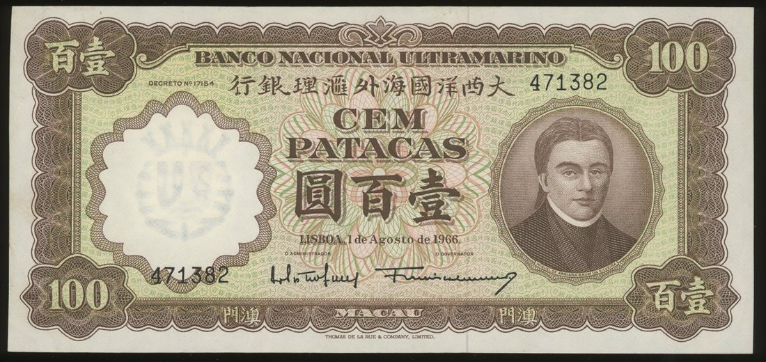 Macau: Banco Nactional Ultramarino, 100 patacas, 1.8.1966, serial number 471382, about uncirculated. A couple of minor folds flattened but the note largely orignal with embossing in the watermark area clearly visible. Very minor toning on edges. Scarce in this grade