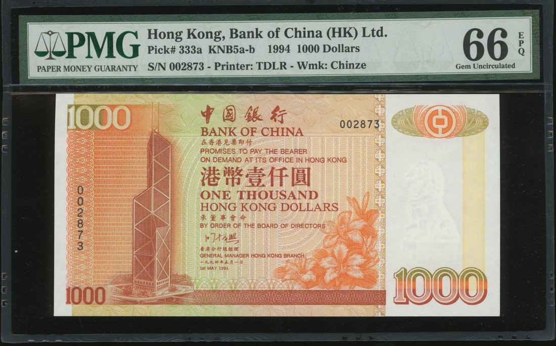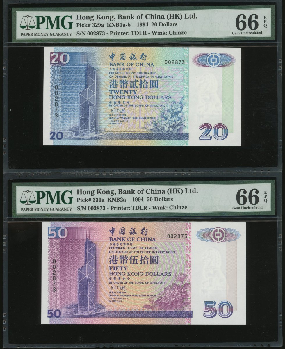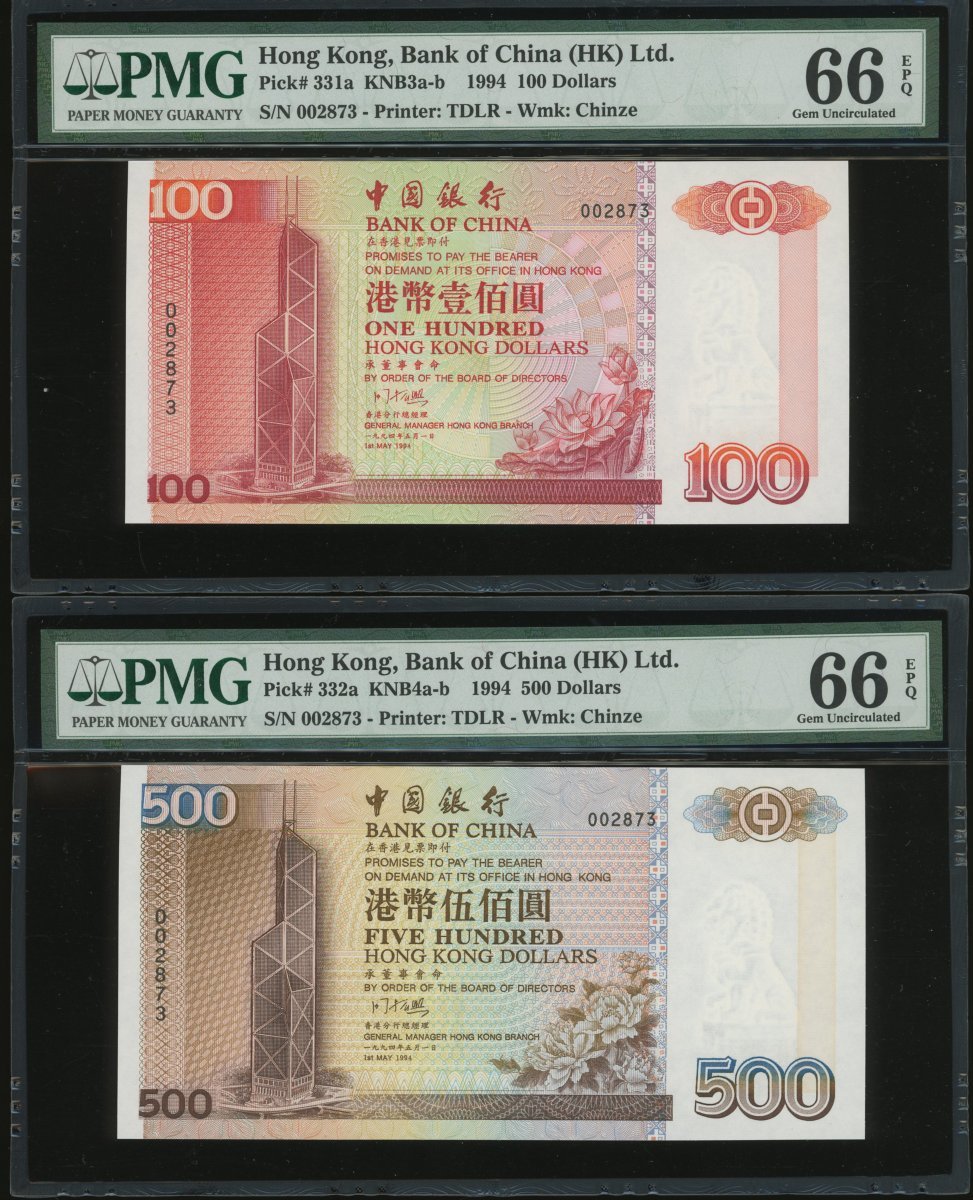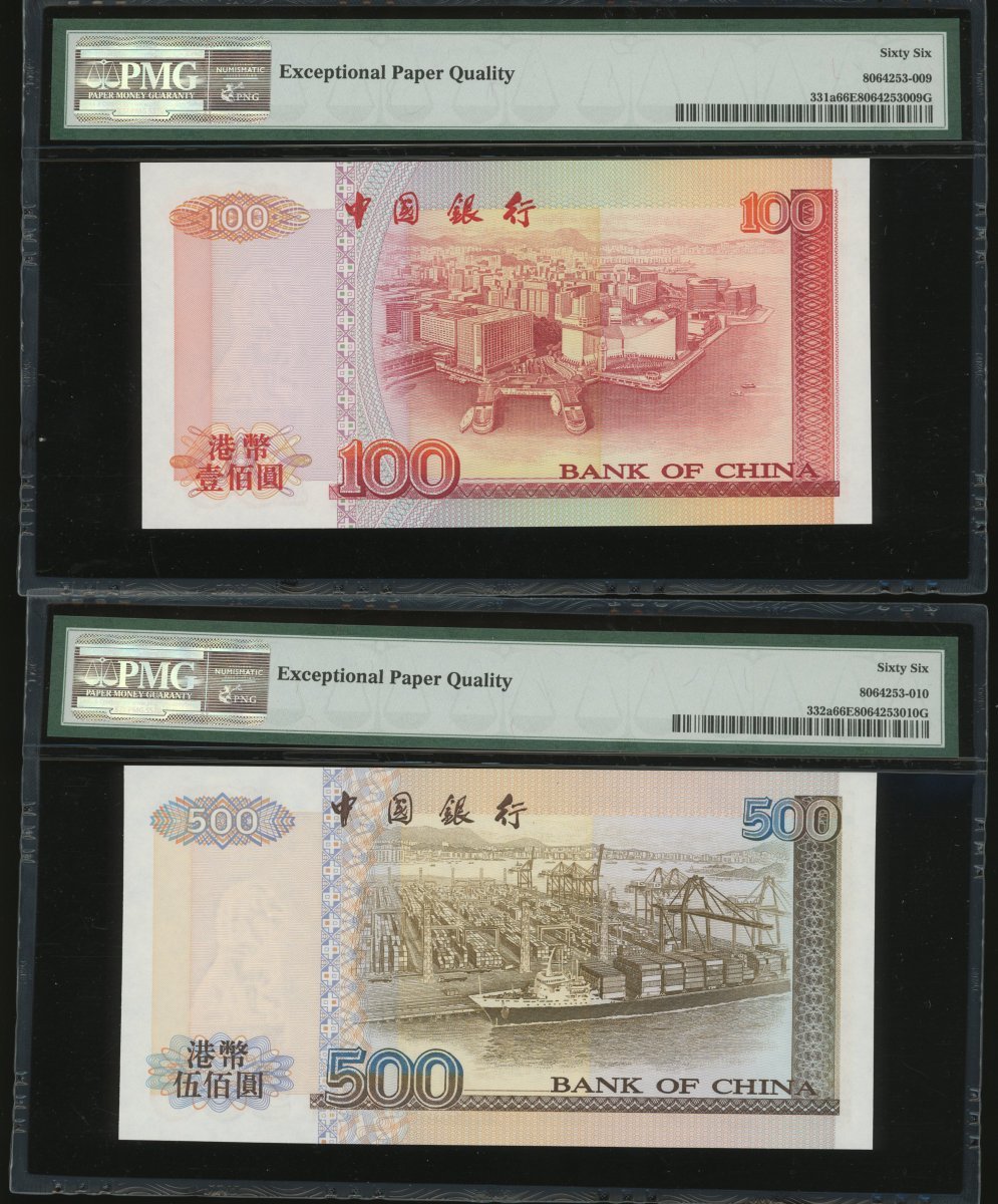 Bank of China, set of 5 commemorative banknotes, 1.5.1994, without prefix 002873, (Pick 329a to 333a), all graded PMG 66EPQ Gem Uncirculated. Very difficult to obtain a set with the same grades (5)