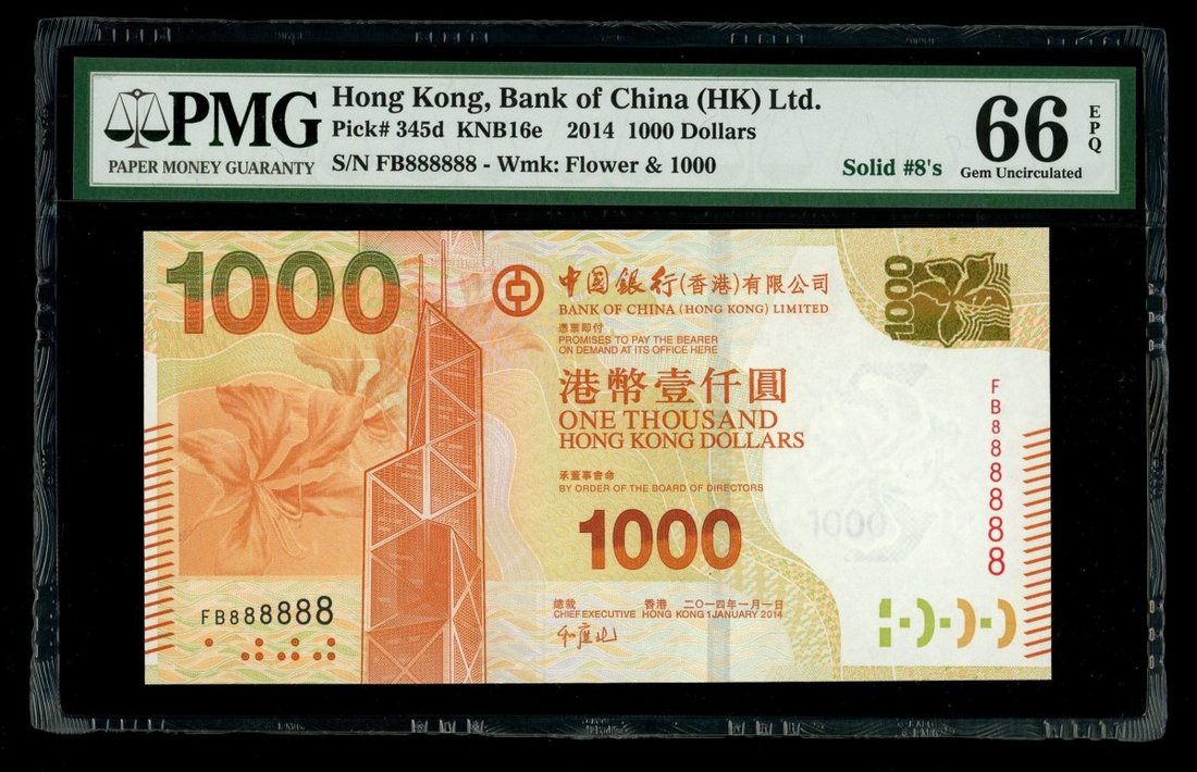 Bank of China, $1000, 1.1.2014, solid serial number FB888888, (Pick 345d), PMG 66EPQ Gem Uncirculated. An ever popular serial number in choice grade. The 'B' in the prefix gives the appearance of an extra 8, giving a total of 9 8's.