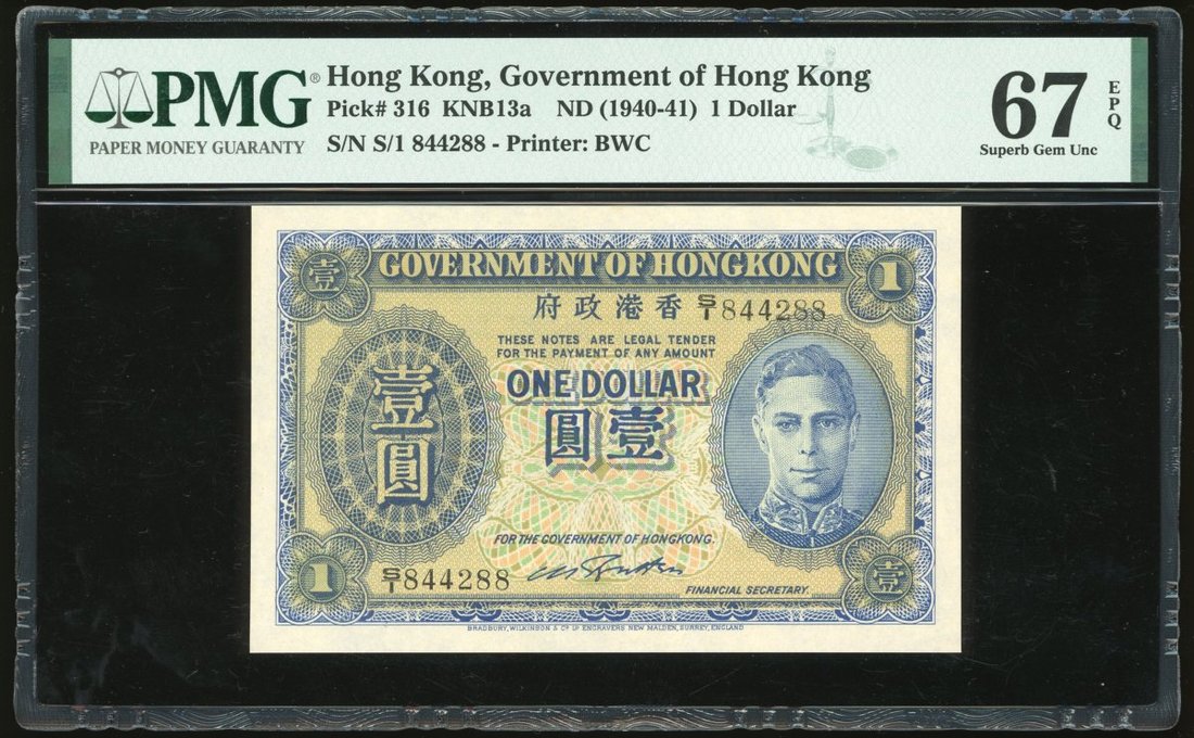 Government of Hongkong, $1, ND (1940-41), serial number S/1 844288, (Pick 316), PMG 67EPQ Superb Gem Uncirculated