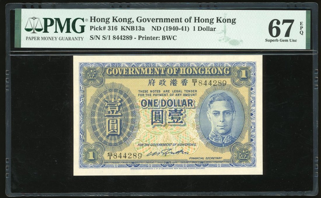 Government of Hongkong, $1, ND (1940-41), serial number S/1 844289, (Pick 316), PMG 67EPQ Superb Gem Uncirculated
