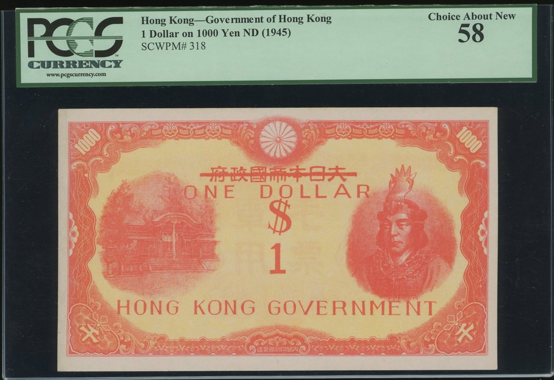 Government of Hong Kong, $1 emergency issue on Japanese 1000 yen, orange on yellow, samurai at right,