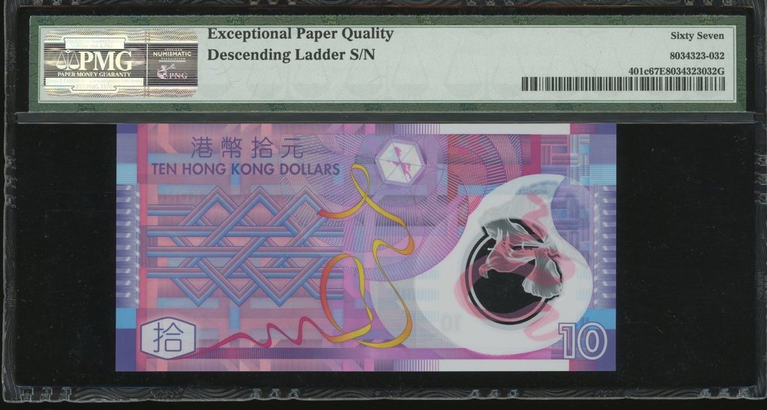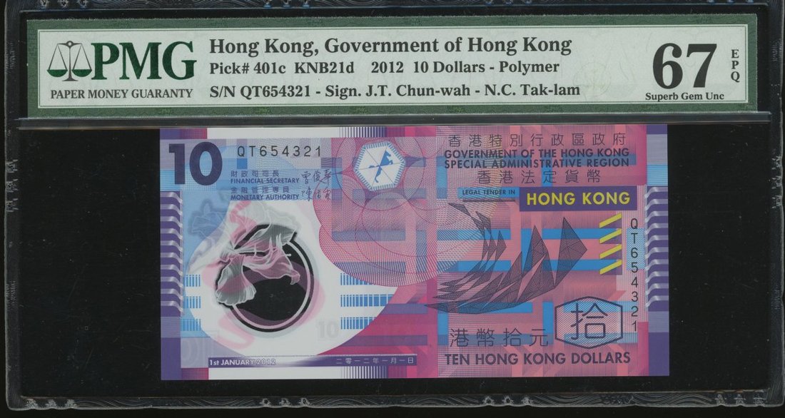 Government of Hong Kong, $10, 1.1.2012, descending ladder serial number QT654321, (Pick 401c), PMG 67EPQ Superb Gem Uncirculated