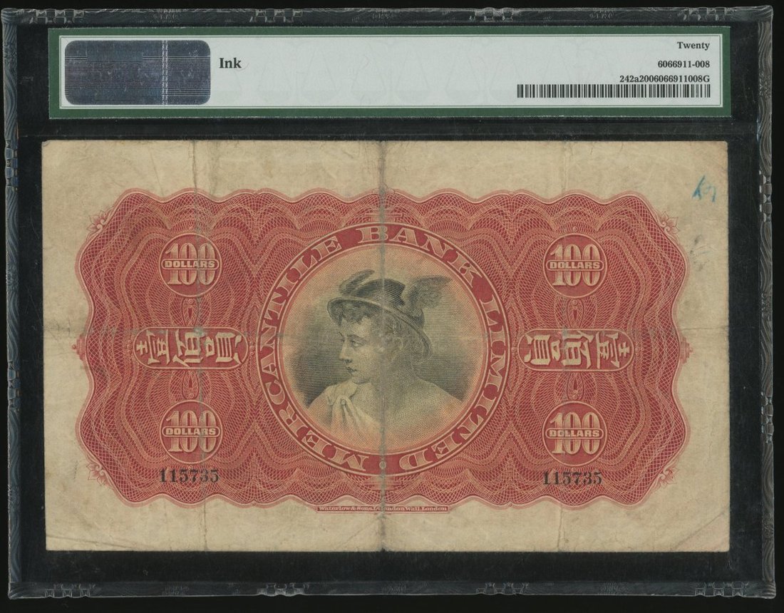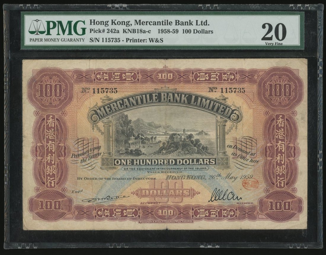 Mercantile Bank Limited, $100, 26.5.1959, serial number 115735, red on orange and light blue underprint, houses below mountains at centre, reverse red and black, Mercury with winged helmet at centre,