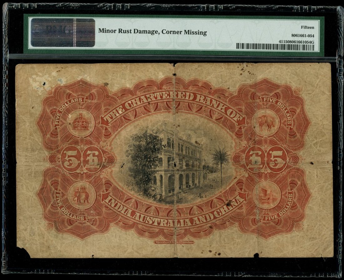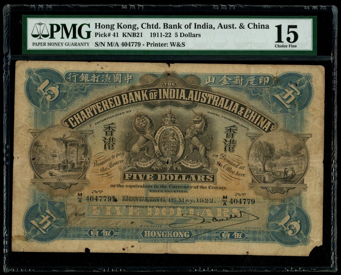 The Chartered Bank of India, Australia and China, $5, 1.5.1922, serial number M/A 404779, blue, orange and black, supported arms upper centre, rice pounding scene at left, sampan at right, handsigned at lower left,