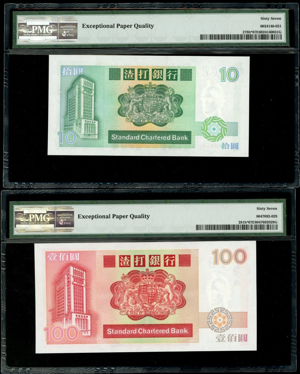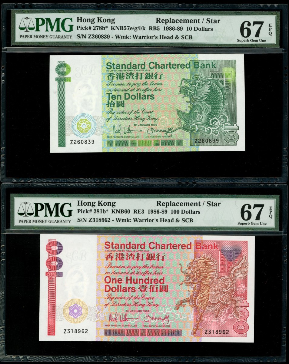 Standard Chartered Bank, lot of 2x replacement notes, $10, Z260839 and $100, Z318962, both dated 1.1.1989, (Pick 278b* and 281b*), both graded PMG 67EPQ with the $100 being scarce (2)