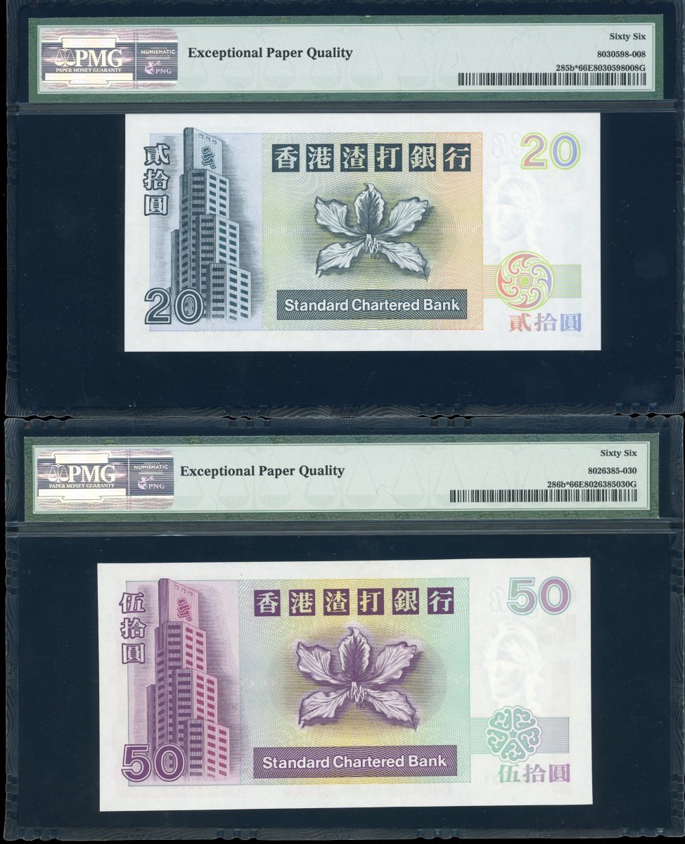 Standard Chartered Bank, lot of 2x replacement notes, $20, Z056481 and $50, Z000523, both dated 1.7.1997, (Pick 285b* and 286b*), both graded PMG 66EPQ with the $50 being very rare (2)