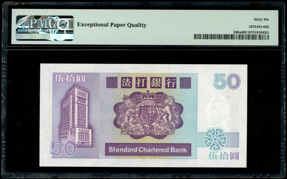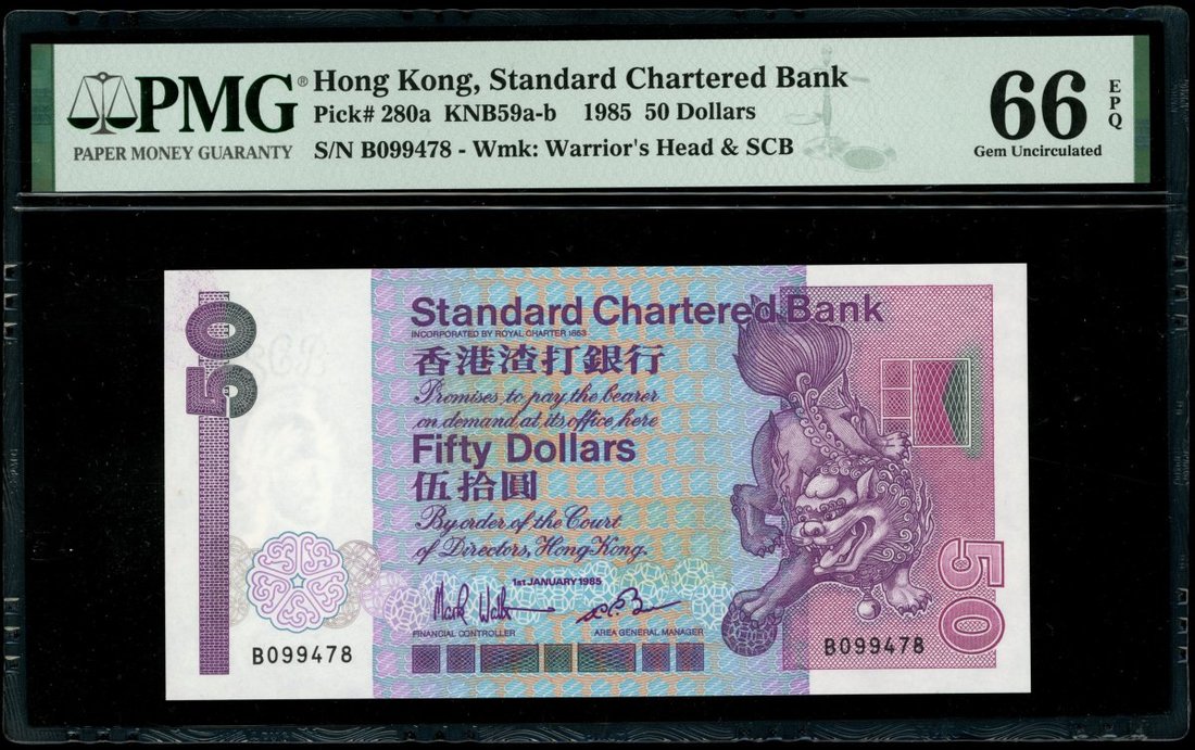 Standard Chartered Bank, $50, 1.1.1985, serial number B099478, (Pick 280a), PMG 66EPQ. Split prefix 1985 and 1987 with the 1985 date being much rarer