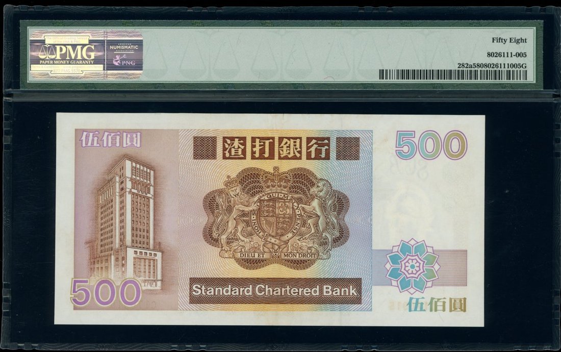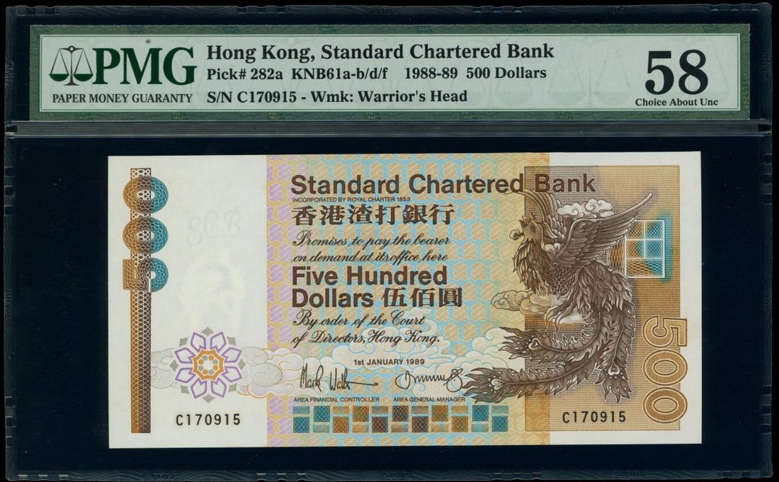 Standard Chartered Bank, $500, 1.1.1989, serial numnber C170915, (Pick 282a), PMG 58 Choice About Uncirculated. The key date of this series with both the B and C prefixs split with other years. Very rare