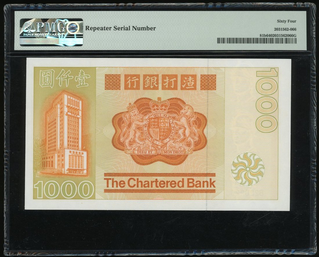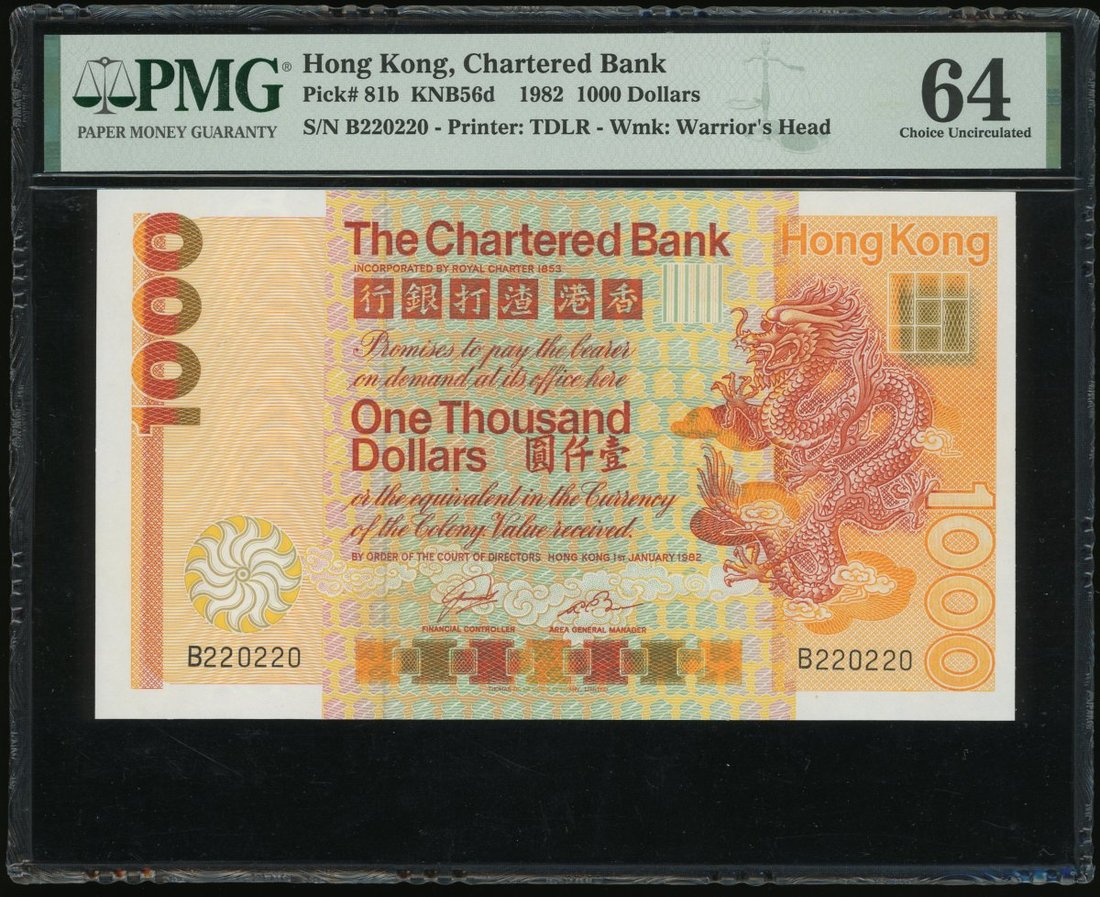 The Chartered Bank, $1000, 1.1.1982, repeater serial number B220220, (Pick 81b), PMG 64 Choice Uncirculated. A nice number on a red hot type!