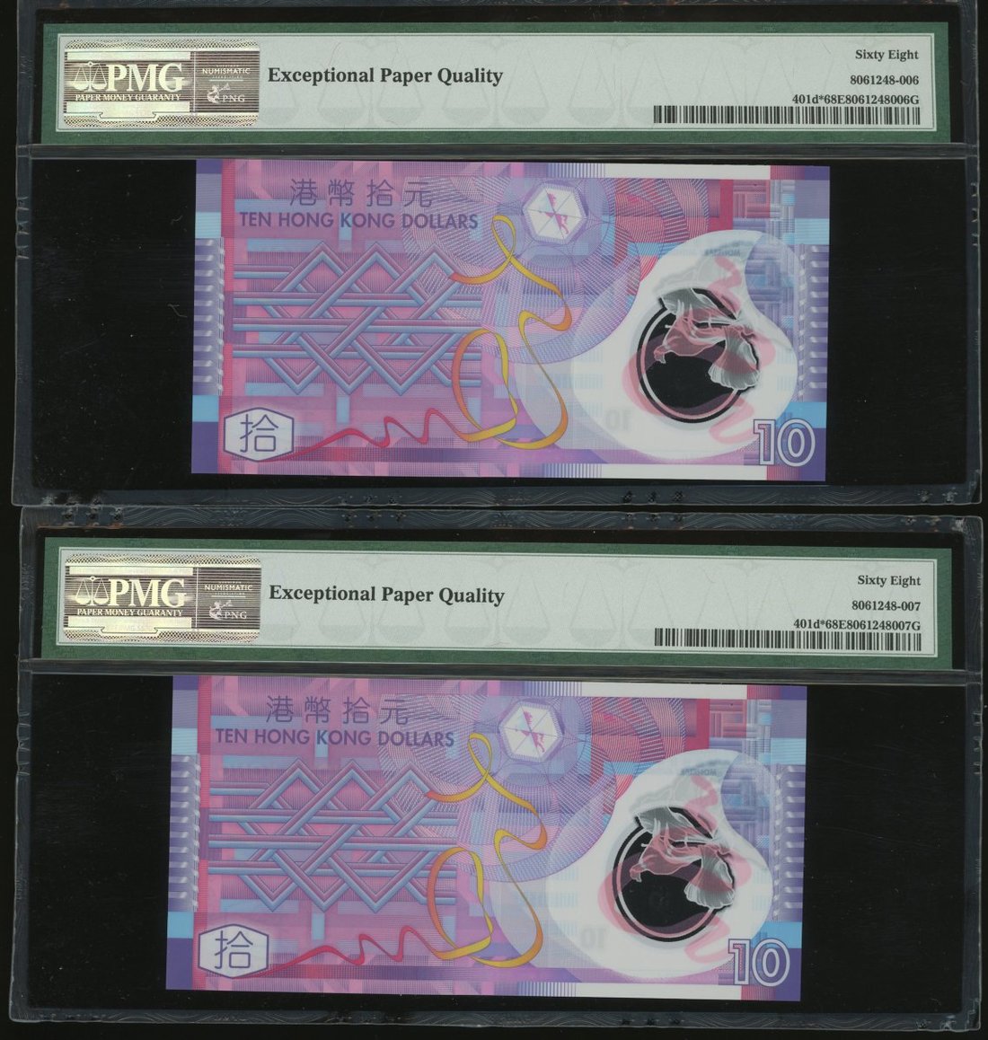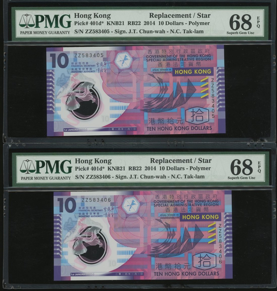 Government of Hong Kong, lot of 2x $10, 1.1.2014, replacement serial numbers ZZ583405 and 406, (Pick 401d*), both graded PMG 68EPQ Superb Gem Uncirculated (2)
