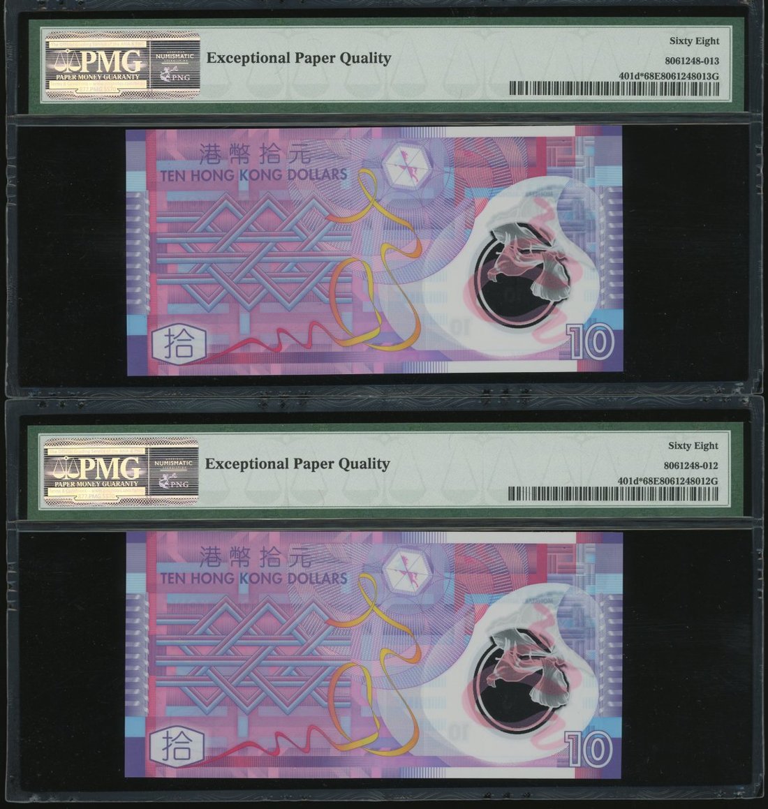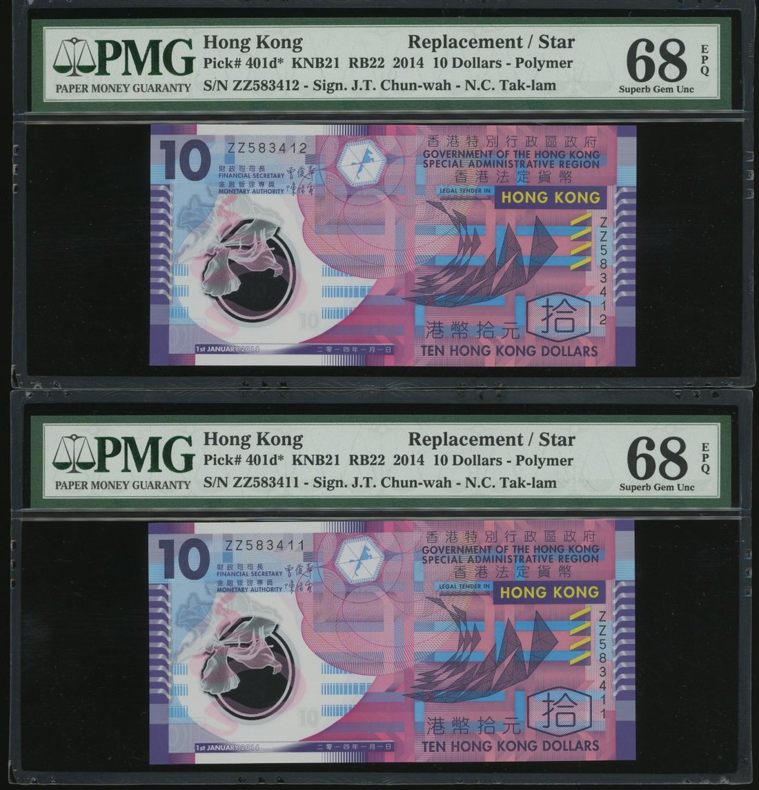Government of Hong Kong, lot of 2x $10, 1.1.2014, replacement serial numbers ZZ583411 and 412, (Pick 401d*), both graded PMG 68EPQ Superb Gem Uncirculated (2)