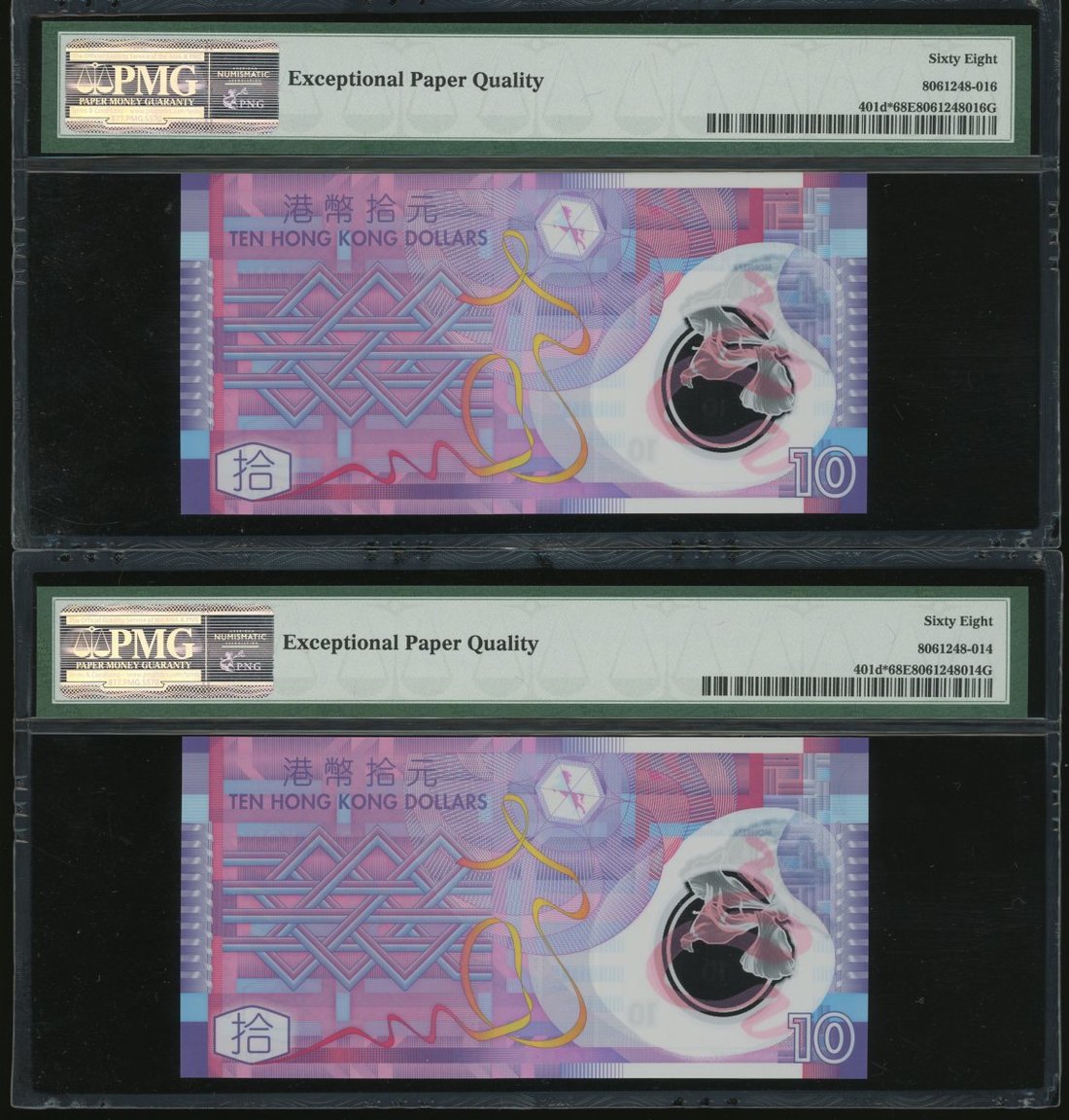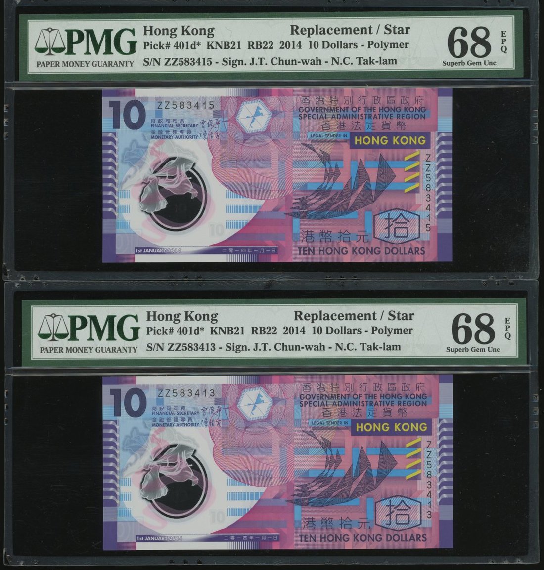 Government of Hong Kong, lot of 2x $10, 1.1.2014, replacement serial numbers ZZ583413 and 415, (Pick 401d*), both graded PMG 68EPQ Superb Gem Uncirculated (2)
