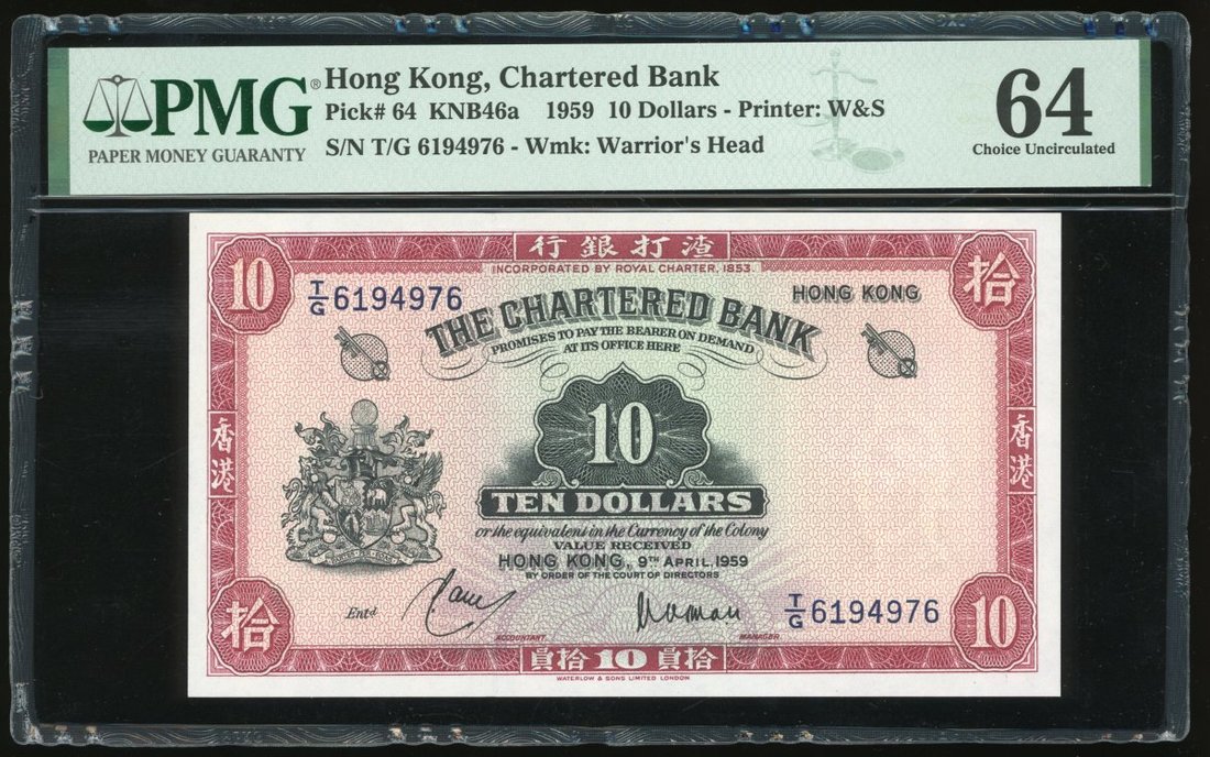 The Chartered Bank, $10, 9.4.1959, serial number T/G 6194976, (Pick 64b), PMG 64 Choice Uncirculated