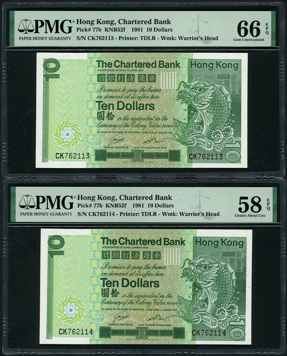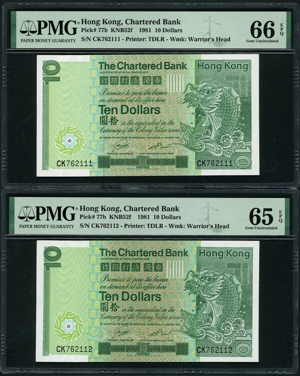 The Chartered Bank, a consecutive group of 7x $10, 1.1.1981, serial numbers CK762111-117, also HSBC $500, 1.1.2014, fancy serial number MS310888, (Pick 77b, 215d), the $10 notes graded PMG 66EPQ, 65EPQ, 66EPQ, 58EPQ, 66EPQ, 66EPQ and 66EPQ, the $500 graded 58EPQ (8)