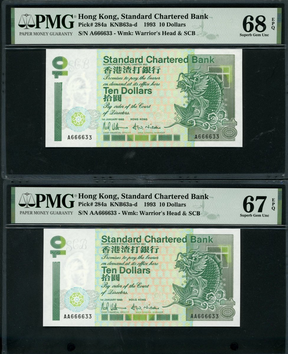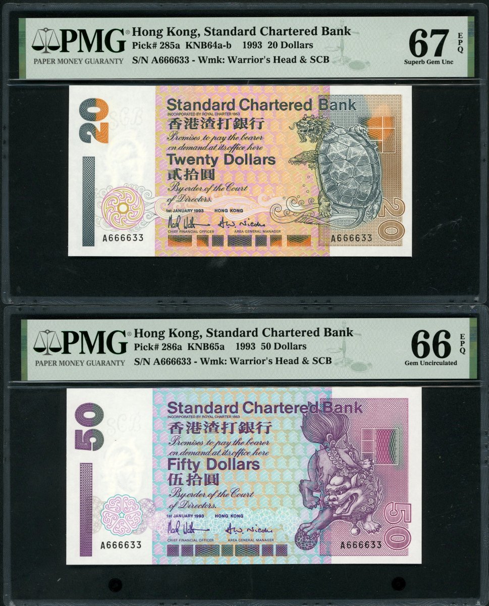 Standard Chartered Bank, group of 4, consisting of $10 (2), $20 and $50, 1.1.1993, matching 'A' and 'AA' prefix notes with identical numbers, the first $10 AA666633, the rest A666633,