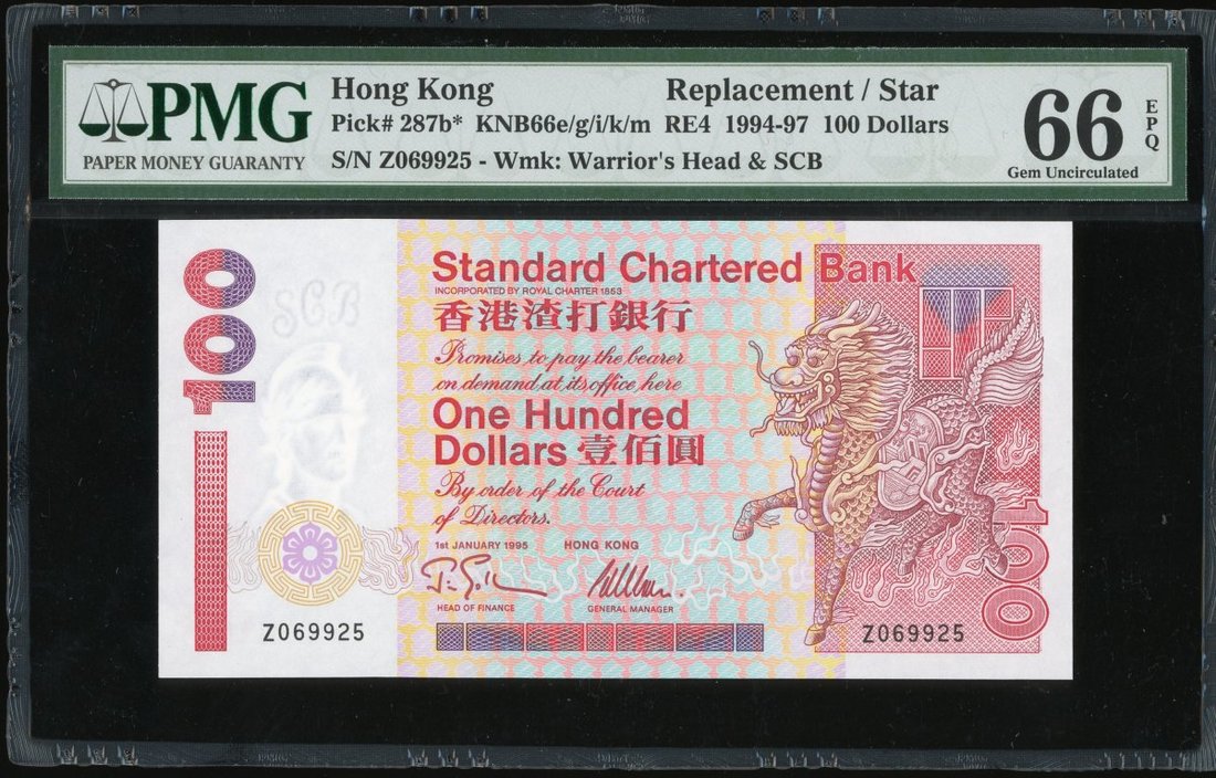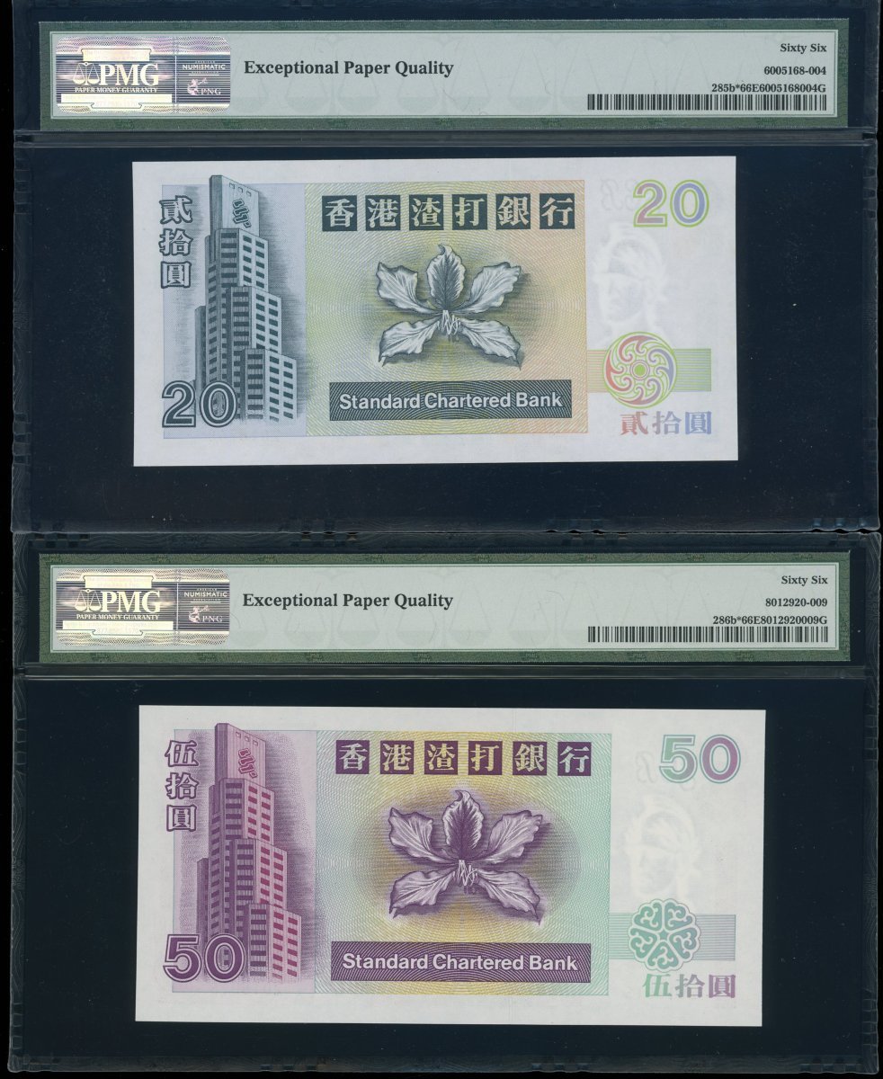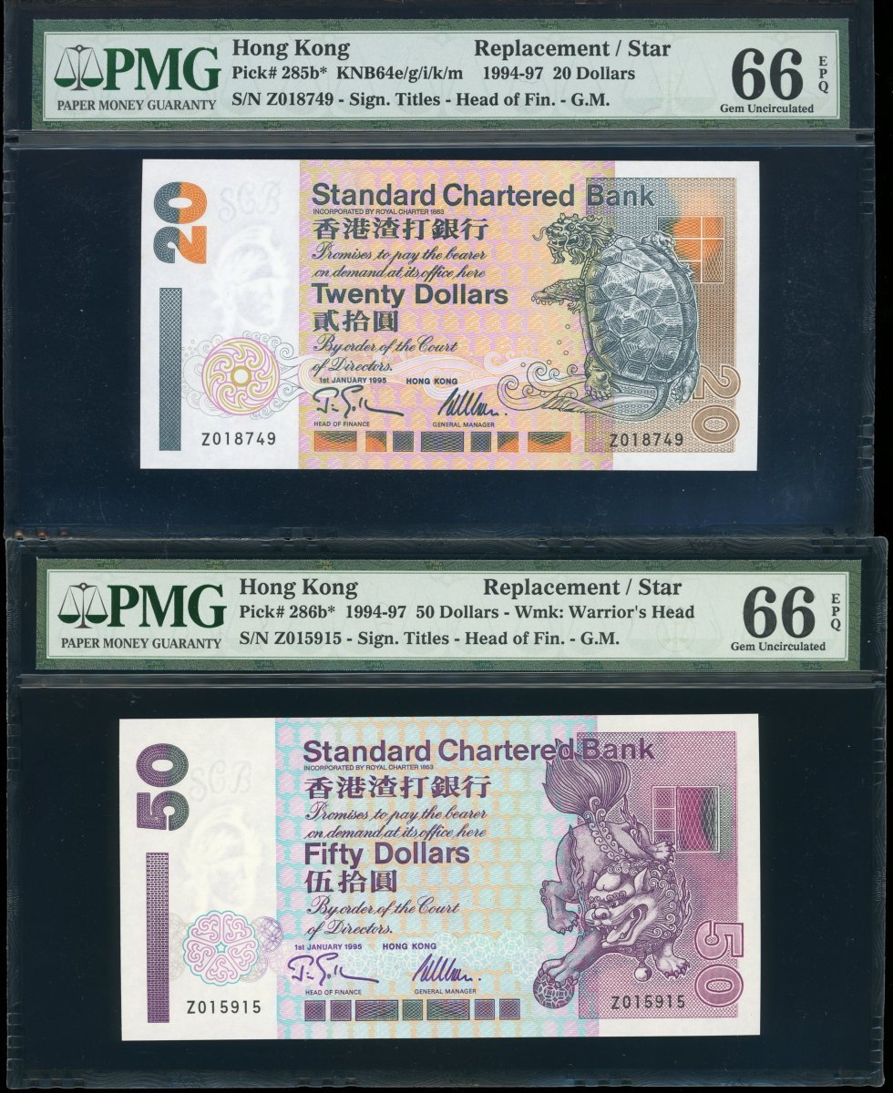 Standard Chartered Bank, group of 3x replacement notes, $20, Z018749, $50, Z015915 and $100, Z069925, all dated 1.1.1995, (Pick 285b* to 287b*), all graded PMG 66EPQ with the $50 being scarce (3)